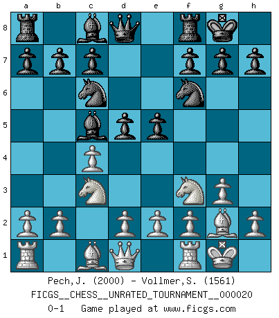 Last move : 0-1 2011 December 1 22:10:13 [Event "FICGS__CHESS__UNRATED_TOURNAMENT__000020"] [Site "FICGS"] [Date "2011.08.30"] [Round "1"] [White "Pech,Jaroslav senior"] [Black "Vollmer,Steve"] [Result "0-1"] [WhiteElo "2000"] [BlackElo "1561"] 1.c4 e5 2.Nc3 Nf6 3.Nf3 Nc6 4.g3 Bc5 5.Bg2 O-O 6.O-O d5 0-1 English Opening Kingside Castling by player Black (move 5) Kingside Castling by player White (move 6) Player Black won this chess game. Follow this game move after move (download)The blunders are all there on the board, waiting to be made. (Savielly Tartakover) Matt entspricht nicht immer den Tatsachen. (Savielly Grigorievitsch Tartakower) Una clavada es mas poderosa que una espada. (Fred Reinfeld) Les pièces de l'échiquier étaient impitoyables. Elles le retenaient, elles l'absorbaient. Il y avait de l'horreur en cela, mais aussi une harmonie unique. Car, qu'y a-t-il dans le monde, à part les échecs ? (V. Nabokov) Better than a thousand days of diligent study is one day with a great teacher. (Japanese proverb)