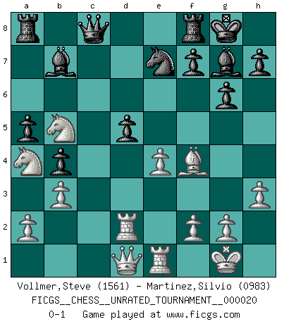 Last move : 0-1 2012 January 22 18:29:55 [Event "FICGS__CHESS__UNRATED_TOURNAMENT__000020"] [Site "FICGS"] [Date "2011.08.30"] [Round "1"] [White "Vollmer,Steve"] [Black "Martinez,Silvio"] [Result "0-1"] [WhiteElo "1561"] [BlackElo "0983"] 1.e4 e5 2.Nf3 Nc6 3.Bb5 Nge7 4.c3 g6 5.d4 exd4 6.cxd4 a6 7.Ba4 b5 8.Bb3 Bg7 9.O-O O-O 10.Nc3 Na5 11.Bc2 d6 12.h3 Bb7 13.Bf4 c5 14.Rc1 b4 15.Na4 cxd4 16.Nxd4 Nc4 17.b3 Na3 18.Re1 Nxc2 19.Rxc2 a5 20.Nb5 d5 21.Rd2 Qc8 0-1 This chess game has been lost on time (started : 2011.08.30 2:32:37) Ruy Lopez : Cozio defense Kingside Castling by player White (move 9) Kingside Castling by player Black (move 9) Player Black won this chess game. Follow this game move after move (download)Any material change in a position must come about by mate, a capture, or a Pawn promotion. (Purdy) Ein guter Spieler hat immer Glück. (José Raúl Capablanca) Con el tiempo, empecé a progresar en partidas decisivas. Tal vez porque me di cuenta de una simple verdad: no solo estaba yo nervioso sino también mi oponente. (Mikhail Tal) Aux échecs, les retours au sommet sont rares : les dommages psychologiques consécutifs à une défaite sont trop sévères. (Daily Telegraph) All politicians must be presumed guilty until they are proven innocent. (Dinesh De Silva)