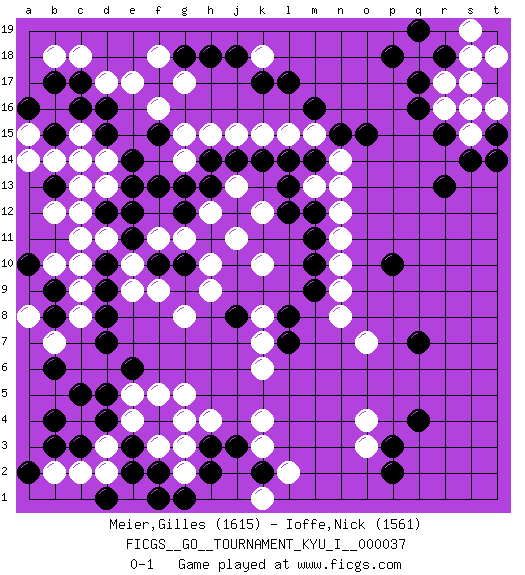 Last move : 0-1 2011 September 7 19:36:59 [Event "FICGS__GO__TOURNAMENT_KYU_I__000037"] [Site "FICGS"] [Date "2011.08.30"] [Round "1"] [Black "Meier,Gilles"] [White "Ioffe,Nick"] [Result "0-1"] [Rating 1 "1615"] [Rating 2 "1561"] 1.q16 d17 2.q4 c4 3.e3 h4 4.d5 e4 5.d4 d3 6.c3 d2 7.e2 c2 8.b3 b2 9.b4 e5 10.c5 f3 11.e6 g5 12.f4 f5 13.f2 g3 14.h2 g2 15.d15 f16 16.l17 o3 17.p3 o4 18.q7 o7 19.r13 d13 20.e14 g14 21.e13 d11 22.c17 c18 23.c16 b18 24.b17 b14 25.c14 c13 26.b15 d14 27.b13 c15 28.h3 c14 29.g1 g4 30.f1 k3 31.j3 k4 32.k2 l2 33.a2 k1 34.d1 l15 35.m16 m15 36.n15 n14 37.o15 r17 38.q17 q18 39.p18 r16 40.r15 s15 41.s14 s18 42.q19 s16 43.r18 s19 44.t17 t18 45.t15 s17 46.t14 t16 47.p2 g8 48.d16 e17 49.f15 g15 50.d12 c12 51.e12 c11 52.e11 e9 53.d10 c10 54.d9 c9 55.d8 e10 56.b8 b12 57.a10 c8 58.d7 b7 59.b6 a8 60.h18 g17 61.g18 k18 62.k17 f18 63.j18 h10 64.g12 j13 65.f10 f9 66.g10 h9 67.h11 k10 68.p10 a15 69.a16 a14 70.f13 j11 71.h13 f11 72.j12 k12 73.j14 h12 74.h14 g11 75.g13 j15 76.k14 k15 77.l13 n12 78.m14 m13 79.l14 h15 80.m12 n13 81.l12 n11 82.m11 n10 83.m10 n9 84.m9 n8 85.l8 k7 86.l7 k6 87.j8 k8 88.b9 b10 0-1 Here are the names of the openings (joseki) played in the four corners : Corner d4 : c4 e3 Komoku (Somok, Xiao~mu`) 3-4 Point. The komoku (3-4) point is the traditional corner enclosure move.. Ikken Kakari (Hankan Keolch'im, Yi Gua`jiao~, 1-Space Low Pincer). The small knight move is the basic approach move to the 3-4 point stone. It has been continually used for over four centuries. There are limitless variations, with new moves constantly being discovered. Black 2 opens the door to a treaure store of joseki. Corner d16 : d17 d15 Komoku (Somok, Xiao~mu`) 3-4 Point. The komoku (3-4) point is the traditional corner enclosure move.. Ikken Takagakari (Hankan Nop'dakeolch'im, Yi Gaogua`jiao~, 1-Space High Approach). The 5-4 approach move has become more popular in modern times, as modern Go emphasizes speed and influence. Corner q4 : q4 o3 Hoshi (Hwajeom, Seongjeom, Xingwei`) 4-4 Point. The star or hoshi (4-4) point, emphasizing influence at the potential expense of territory. Ikken Kakari (Hankan Keolch'im, Yi Gua`jiao~, 1-Space Low Approach). White 2 is the standard approach move to the 4-4. Player White won this Go (weiqi, baduk) game. Follow this game move after move (download)It is difficult to know exactly what you are doing. (Pierre Audouard) I feel so... helpless. (C-3PO in Star Wars ep.3)