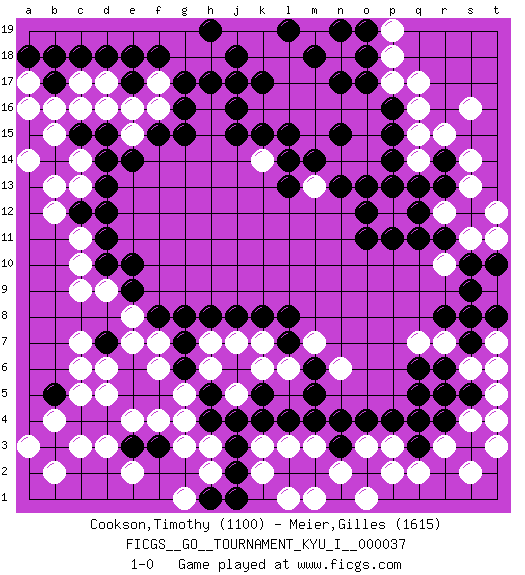 Last move : 1-0 2012 April 17 7:29:19 [Event "FICGS__GO__TOURNAMENT_KYU_I__000037"] [Site "FICGS"] [Date "2011.08.30"] [Round "1"] [Black "Cookson,Timothy"] [White "Meier,Gilles"] [Result "1-0"] [Rating 1 "1100"] [Rating 2 "1615"] 1.d4 q16 2.r4 d16 3.r14 n16 4.q11 c6 5.e6 c9 6.d7 c7 7.d12 c14 8.e9 p3 9.p4 r3 10.o4 o3 11.n3 s4 12.q3 q2 13.q4 s2 14.j3 c3 15.c4 d3 16.e3 e2 17.b3 b2 18.b5 a3 19.j16 l17 20.k15 e4 21.f3 b4 22.e14 d5 23.e5 c5 24.s5 t3 25.p14 s16 26.p16 p17 27.o17 o16 28.p15 q17 29.n17 m16 30.m14 n14 31.n13 o14 32.o13 m15 33.g17 m13 34.l14 p13 35.o11 o15 36.q13 p12 37.o12 r15 38.q12 q14 39.p11 q15 40.p13 s14 41.r13 f4 42.h5 g3 43.l4 n2 44.o2 p2 45.m2 o1 46.d18 c17 47.c18 s6 48.r6 t5 49.s7 r5 50.q5 r7 51.s5 t6 52.r8 q7 53.s8 m3 54.n4 l3 55.l2 k3 56.k4 k2 57.l7 g5 58.g6 h6 59.j6 h7 60.h8 j7 61.j8 j5 62.h4 k6 63.j2 l1 64.m4 m1 65.g7 k7 66.k8 l6 67.m6 f6 68.f5 g4 69.k5 f7 70.g8 e7 71.f8 d6 72.j18 l18 73.c12 b13 74.e17 e16 75.f15 f16 76.g16 f17 77.f18 d17 78.e18 b12 79.d10 t11 80.s10 s11 81.s12 t12 82.r11 s13 83.b17 b16 84.b18 m7 85.l8 k14 86.l15 c10 87.d13 e15 88.d15 c16 89.d14 t9 90.s9 k16 91.j15 r5 92.q6 h2 93.j1 j17 94.h17 k18 95.t10 r12 96.k17 l16 97.j17 e8 98.c15 b15 99.l13 c11 100.d11 d9 101.e10 t7 102.t8 h3 103.j4 j19 104.h19 k19 105.h1 g1 106.s5 t4 107.r5 a17 108.a18 a16 109.g15 c13 110.o18 p18 111.o19 p19 112.m18 m19 113.n19 m17 114.l19 n6 115.m5 m19 116.b14 a14 117.l19 r10 118.n15 1-0 Here are the names of the openings (joseki) played in the four corners : Corner q16 : q16 r14 Hoshi (Hwajeom, Seongjeom, Xingwei`) 4-4 Point. The star or hoshi (4-4) point, emphasizing influence at the potential expense of territory. Ikken Kakari (Hankan Keolch'im, Yi Gua`jiao~, 1-Space Low Approach). Black 2 is the standard approach move to the 4-4. Corner d4 : d4 c6 Hoshi (Hwajeom, Seongjeom, Xingwei`) 4-4 Point. The star or hoshi (4-4) point, emphasizing influence at the potential expense of territory. Ikken Kakari (Hankan Keolch'im, Yi Gua`jiao~, 1-Space Low Approach). White 2 is the standard approach move to the 4-4. Corner d16 : d16 d12 Hoshi (Hwajeom, Seongjeom, Xingwei`) 4-4 Point. The star or hoshi (4-4) point, emphasizing influence at the potential expense of territory. Corner q4 : r4 p3 Komoku (Somok, Xiao~mu`) 3-4 Point. The komoku (3-4) point is the traditional corner enclosure move.. Ikken Kakari (Hankan Keolch'im, Yi Gua`jiao~, 1-Space Low Pincer). The small knight move is the basic approach move to the 3-4 point stone. It has been continually used for over four centuries. There are limitless variations, with new moves constantly being discovered. White 2 opens the door to a treaure store of joseki. Player Black won this Go (weiqi, baduk) game. Follow this game move after move (download)Keep inessential ataris till the end. (Anonymous) If you lose the game you should win the analysis! (Proverb)