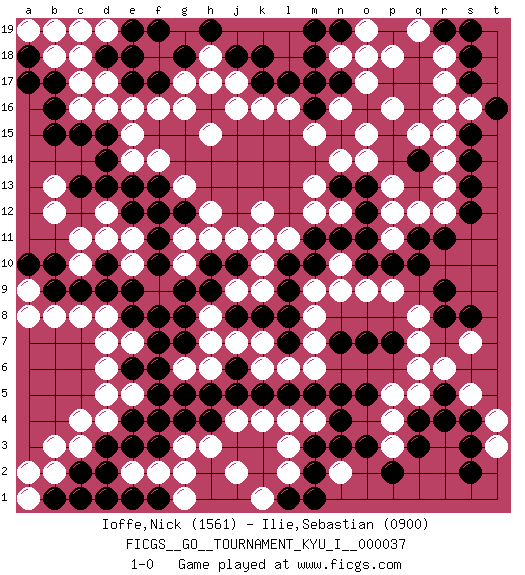 Last move : 1-0 2012 April 2 22:59:41 [Event "FICGS__GO__TOURNAMENT_KYU_I__000037"] [Site "FICGS"] [Date "2011.08.30"] [Round "1"] [Black "Ioffe,Nick"] [White "Ilie,Sebastian"] [Result "1-0"] [Rating 1 "1561"] [Rating 2 "0900"] 1.q16 d17 2.q4 d4 3.q10 o17 4.m17 o15 5.q14 l16 6.m16 m15 7.l17 k16 8.k17 j16 9.h17 n16 10.f4 j4 11.f6 d6 12.f8 d8 13.f10 m4 14.o3 g3 15.d3 c3 16.e3 c4 17.m2 n2 18.n3 l2 19.m3 l3 20.k5 k4 21.d15 d16 22.b15 e15 23.d14 c11 24.b17 c16 25.b16 b13 26.c13 b12 27.c15 c18 28.e12 e11 29.f11 d12 30.e13 g13 31.f12 f14 32.f17 f16 33.q18 p18 34.p17 p16 35.q17 n18 36.h16 h15 37.e18 j17 38.j18 h18 39.k18 g17 40.g18 g16 41.h19 h17 42.e17 e16 43.d18 c17 44.m18 q6 45.r5 r6 46.r8 q8 47.r9 p4 48.q3 s5 49.s4 q5 50.r4 s7 51.o5 p5 52.n5 p3 53.p2 q12 54.o11 p13 55.o7 p9 56.p10 o9 57.m11 m9 58.k11 h11 59.h10 j11 60.j10 k10 61.l10 k9 62.l9 k12 63.k8 l11 64.m10 m8 65.l8 n10 66.n11 m7 67.m5 l6 68.l5 k6 69.j6 j7 70.j8 h6 71.j5 k7 72.h5 h8 73.g8 g6 74.g5 h7 75.g7 j9 76.h9 k11 77.p7 q7 78.l7 m6 79.s8 p11 80.o10 n9 81.s12 r13 82.s13 r14 83.s14 r15 84.s15 r16 85.s17 r17 86.s18 r18 87.r19 q15 88.s19 s16 89.t16 q19 90.r11 t4 91.s3 t3 92.s2 m13 93.c2 b2 94.d2 e5 95.f5 f2 96.l1 k1 97.m1 j2 98.d10 d11 99.d9 c8 100.b10 c10 101.c9 e7 102.f7 g10 103.g9 g11 104.e8 e10 105.e9 b8 106.b9 a9 107.a10 a8 108.e6 d7 109.e4 d5 110.b1 b3 111.n7 m12 112.o13 o14 113.n13 n14 114.g12 h12 115.n19 o19 116.m19 d19 117.f19 c19 118.e19 b18 119.a18 l4 120.h4 h3 121.f3 e2 122.e1 g2 123.f1 g1 124.d1 e14 125.d13 r12 126.q11 p12 127.n17 o18 128.n4 a2 129.f13 a1 130.c1 b19 131.g4 a19 132.a17 n12 133.o12 pass 134.pass 1-0 This go game has been lost on time (started : 2011.08.30 22:50:24) Here are the names of the openings (joseki) played in the four corners : Corner q16 : q16 o17 Hoshi (Hwajeom, Seongjeom, Xingwei`) 4-4 Point. The star or hoshi (4-4) point, emphasizing influence at the potential expense of territory. Ikken Kakari (Hankan Keolch'im, Yi Gua`jiao~, 1-Space Low Approach). White 2 is the standard approach move to the 4-4. Corner d4 : d4 f4 Hoshi (Hwajeom, Seongjeom, Xingwei`) 4-4 Point. The star or hoshi (4-4) point, emphasizing influence at the potential expense of territory. Ikken Takagakari (Hankan Nop'dakeolch'im, Yi Gaojia, 1-Space High Approach). White typically responds at 6-4 or 3-10. White 4-10 is played when White finds play on the right side advantageous. White 4-8 or 3-8 may be played when White has support at top. Corner q4 : q4 m4 Hoshi (Hwajeom, Seongjeom, Xingwei`) 4-4 Point. The star or hoshi (4-4) point, emphasizing influence at the potential expense of territory. Player Black won this Go (weiqi, baduk) game. Follow this game move after move (download)Don't make dango's. (Anonymous) Chess, like love, like music, has the power to make people happy. (Siegbert Tarrasch)