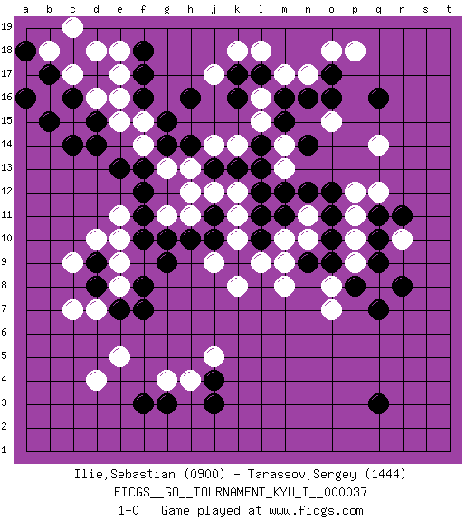 Last move : 1-0 2011 November 13 10:55:1 [Event "FICGS__GO__TOURNAMENT_KYU_I__000037"] [Site "FICGS"] [Date "2011.08.30"] [Round "1"] [Black "Ilie,Sebastian"] [White "Tarassov,Sergey"] [Result "1-0"] [Rating 1 "0900"] [Rating 2 "1444"] 1.q16 d4 2.q3 d16 3.f3 e5 4.j3 d10 5.k16 r10 6.r8 p10 7.p8 q14 8.o17 o15 9.f17 f15 10.g15 f14 11.g14 g13 12.f13 h13 13.f16 e15 14.e13 m8 15.o10 p9 16.o9 q8 17.q7 o8 18.q9 o7 19.q10 p11 20.q11 q12 21.o11 p12 22.r11 k14 23.c14 c15 24.d14 c17 25.d15 e16 26.b15 e18 27.f18 e17 28.b17 b16 29.a16 b18 30.c16 d18 31.a18 c19 32.l11 j9 33.j11 h11 34.k9 m10 35.m11 k10 36.l10 l9 37.j10 k8 38.h10 g11 39.j13 j14 40.g9 g4 41.g3 h4 42.j4 j5 43.d9 e9 44.d8 e8 45.e7 d7 46.f7 c7 47.f8 c9 48.f10 e11 49.f11 k18 50.h16 m17 51.l17 l18 52.m16 n17 53.n16 o18 54.o16 p18 55.h14 j12 56.k13 k12 57.l13 k11 58.l12 e10 59.g10 h12 60.f12 n11 61.n12 n10 62.n9 m9 63.o12 l15 64.m15 m14 65.n14 m13 66.m12 l16 67.k17 j17 68.l14 1-0 Here are the names of the openings (joseki) played in the four corners : Corner d4 : d4 f3 Hoshi (Hwajeom, Seongjeom, Xingwei`) 4-4 Point. The star or hoshi (4-4) point, emphasizing influence at the potential expense of territory. Ikken Kakari (Hankan Keolch'im, Yi Gua`jiao~, 1-Space Low Approach). Black 2 is the standard approach move to the 4-4. Corner q16 : q16 q14 Hoshi (Hwajeom, Seongjeom, Xingwei`) 4-4 Point. The star or hoshi (4-4) point, emphasizing influence at the potential expense of territory. Ikken Takagakari (Hankan Nop'dakeolch'im, Yi Gaojia, 1-Space High Approach). Black typically responds at 6-4 or 3-10. Black 4-10 is played when Black finds play on the right side advantageous. Black 4-8 or 3-8 may be played when Black has support at top. Corner d16 : d16 f17 Hoshi (Hwajeom, Seongjeom, Xingwei`) 4-4 Point. The star or hoshi (4-4) point, emphasizing influence at the potential expense of territory. Ikken Kakari (Hankan Keolch'im, Yi Gua`jiao~, 1-Space Low Approach). Black 2 is the standard approach move to the 4-4. Player Black won this Go (weiqi, baduk) game. Follow this game move after move (download)There is no territory in the centre. (Anonymous) Is not life a hundred times too short to bore ourselves ? (Friedrich Nietzsche)