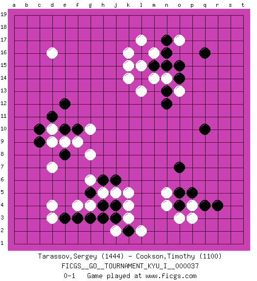 Last move : 0-1 2011 December 30 17:33:13 [Event "FICGS__GO__TOURNAMENT_KYU_I__000037"] [Site "FICGS"] [Date "2011.08.30"] [Round "1"] [Black "Tarassov,Sergey"] [White "Cookson,Timothy"] [Result "0-1"] [Rating 1 "1444"] [Rating 2 "1100"] 1.q16 d16 2.q4 d4 3.q10 o17 4.o15 m16 5.m15 l15 6.l16 m14 7.n15 k16 8.l14 k15 9.n16 l13 10.n13 o3 11.o4 n4 12.o5 p3 13.r4 p4 14.p5 n5 15.o7 l17 16.n17 d10 17.f10 k14 18.e12 d7 19.h4 g8 20.e8 f9 21.e10 e9 22.d11 k3 23.e3 g10 24.c10 d9 25.c9 n14 26.o14 o13 27.n12 d3 28.j3 k4 29.j6 j5 30.h6 h5 31.g5 f4 32.f3 g4 33.g3 g6 34.j4 k5 35.k2 j2 36.h3 l2 0-1 This go game has been lost on time (started : 2011.08.30 22:50:24) Here are the names of the openings (joseki) played in the four corners : Corner q16 : q16 o17 Hoshi (Hwajeom, Seongjeom, Xingwei`) 4-4 Point. The star or hoshi (4-4) point, emphasizing influence at the potential expense of territory. Ikken Kakari (Hankan Keolch'im, Yi Gua`jiao~, 1-Space Low Approach). White 2 is the standard approach move to the 4-4. Corner q4 : q4 o3 Hoshi (Hwajeom, Seongjeom, Xingwei`) 4-4 Point. The star or hoshi (4-4) point, emphasizing influence at the potential expense of territory. Ikken Kakari (Hankan Keolch'im, Yi Gua`jiao~, 1-Space Low Approach). White 2 is the standard approach move to the 4-4. Corner d16 : d16 e12 Hoshi (Hwajeom, Seongjeom, Xingwei`) 4-4 Point. The star or hoshi (4-4) point, emphasizing influence at the potential expense of territory. Player White won this Go (weiqi, baduk) game. Follow this game move after move (download)If you have won four corners, resign. (Anonymous) Vladimir Ras-Putin is still alive... He is also a good actor, I saw him in the Lord of the Rings. (Rodolfo d'Ettorre)