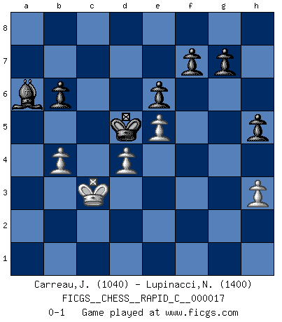 Last move : 0-1 2007 March 8 13:1:15 [Event "FICGS__CHESS__RAPID_C__000017"] [Site "FICGS"] [Date "2007.01.02"] [Round "1"] [White "Carreau,Jean-Francois"] [Black "Lupinacci,Nicola"] [Result "0-1"] [WhiteElo "1040"] [BlackElo "1400"] 1.g3 d5 2.d4 b6 3.Bg2 Bb7 4.Nc3 Nf6 5.Bf4 e6 6.Nb5 Bd6 7.Qd3 Bxf4 8.gxf4 Ba6 9.O-O-O c6 10.a4 cxb5 11.axb5 Bb7 12.c4 Qc7 13.Nf3 Qxf4+ 14.e3 Qc7 15.Kb1 Qxc4 16.Ne5 Qxd3+ 17.Rxd3 Nbd7 18.Rc1 Rc8 19.Rdc3 O-O 20.Nxd7 Nxd7 21.Ka1 Rxc3 22.Rxc3 Rc8 23.Rxc8+ Bxc8 24.e4 dxe4 25.Bxe4 Nf6 26.f3 Nxe4 27.fxe4 a6 28.bxa6 Bxa6 29.b4 Kf8 30.Kb2 Ke7 31.Kc3 Kd6 32.e5+ Kd5 33.h3 h5 0-1 This chess game has been lost on time (started : 2007.01.02 16:39:44) Benko's Opening Queenside Castling by player White (move 9) Kingside Castling by player Black (move 19) Player Black won this chess game. Follow this game move after move (download)Modern Chess is too much concerned with things like Pawn structure. Forget it, Checkmate ends the game. (Nigel Short) Ich suche im Schach immer etwas Eigenes. Riskantes Spiel im Stile schachlicher Musketiere ist nicht meine Sache, auch wenn es vielen Freunden scharfer Wendungen gefällt. (Anatoly Karpov) El Ajedrez, como cualquier actividad creativa, solo puede existir a través del esfuerzo combinado de aquellos que tienen talento creativo y de aquellos que poseen la habilidad de organizar su trabajo creativo. (Mikhail Botvinnik) Seul un grand joueur sait à quel point il joue faiblement. (Xavier Tartacover) No enterprise is more likely to succeed than one concealed from the enemy until it is ripe for execution. (Niccolo Machiavelli)