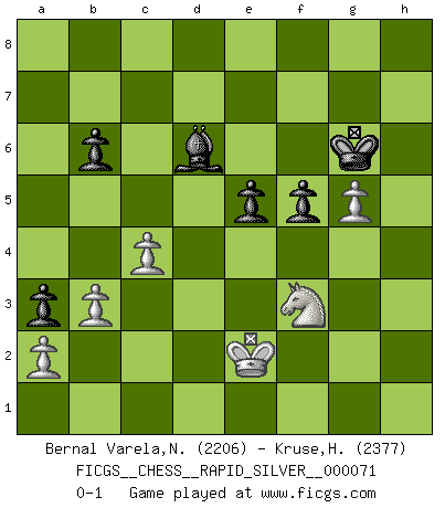 Last move : 0-1 2011 December 9 4:18:57 [Event "FICGS__CHESS__RAPID_SILVER__000071"] [Site "FICGS"] [Date "2011.08.31"] [Round "1"] [White "Bernal Varela,Nelson"] [Black "Kruse,Herbert"] [Result "0-1"] [WhiteElo "2206"] [BlackElo "2377"] 1.e4 c6 2.d4 d5 3.Nc3 dxe4 4.Nxe4 Bf5 5.Ng3 Bg6 6.Nf3 Nd7 7.Bd3 e6 8.Bf4 Ngf6 9.Bxg6 hxg6 10.O-O Qb6 11.Qe2 c5 12.Rad1 cxd4 13.Nxd4 Bc5 14.Nb3 Be7 15.Ne4 Nxe4 16.Qxe4 Nf6 17.Qc4 Rh5 18.Rfe1 Qb5 19.Qxb5+ Rxb5 20.Be5 Rc8 21.Re2 a5 22.g3 a4 23.Nc1 g5 24.Nd3 a3 25.b3 Rd5 26.Rf1 R5d8 27.f4 gxf4 28.Nxf4 Bc5+ 29.Kh1 Bd4 30.Bxf6 Bxf6 31.c4 Rc5 32.Nd5 Be7 33.Nc3 Rc7 34.Ne4 f5 35.Nd2 Rcd7 36.Nf3 Rd1 37.Rxd1 Rxd1+ 38.Re1 Rd3 39.Kg2 g5 40.Re2 Rd1 41.h3 Kf7 42.Re1 Rd8 43.g4 Kf6 44.Re2 Bb4 45.h4 gxh4 46.g5+ Kf7 47.Ne5+ Kg7 48.Nf3 Rd3 49.Nxh4 Rd2 50.Rxd2 Bxd2 51.Nf3 Bc3 52.Nh4 Bb4 53.Kg3 Kf7 54.Kh3 Bd6 55.Ng2 b6 56.Nh4 Kg7 57.Kg2 Be7 58.Nf3 Kg6 59.Kf1 Bd6 60.Ke2 e5 0-1 Caro-Kann : Classical variation Kingside Castling by player White (move 10) Player Black won this chess game. Follow this game move after move (download)When you play Bobby, it is not a question if you win or lose. It is a question if you survive. (Boris Spassky) Wenn Capablanka heute auf der Schachbühne erscheinen würde, hätte er ein halbes Jahr gebraucht um sich die Schachtheorie anzueignen. Und dann hätte er alles und jeden besiegt. (Mikhail Moiseyevich Botvinik) Hay dos clases de hombres: aquellos que se conforman en dejarse llevar por las circunstancias y que juegan barajas y aquellos decididos a controlar las circunstancias y que juegan al Ajedrez. (Mortimer Collins) Il (Jacob Murray) ne joue pas pour le bon coup, mais pour le meilleur. (Eloi Relange) Life doesn't imitate art, it imitates bad television. (Woody Allen)