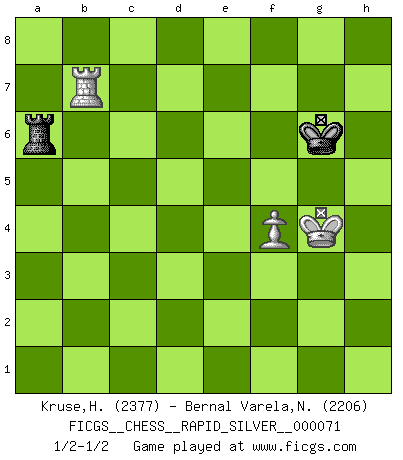 Last move : 1/2-1/2 2011 December 8 12:13:13 [Event "FICGS__CHESS__RAPID_SILVER__000071"] [Site "FICGS"] [Date "2011.08.31"] [Round "2"] [White "Kruse,Herbert"] [Black "Bernal Varela,Nelson"] [Result "1/2-1/2"] [WhiteElo "2377"] [BlackElo "2206"] 1.d4 Nf6 2.c4 g6 3.Nc3 d5 4.Nf3 Bg7 5.Qb3 dxc4 6.Qxc4 O-O 7.e4 b6 8.e5 Be6 9.exf6 Bxc4 10.fxg7 Kxg7 11.Bxc4 c6 12.O-O Nd7 13.d5 b5 14.dxc6 bxc4 15.Rd1 Qc8 16.Rxd7 Re8 17.Bf4 Qxc6 18.Rad1 Rac8 19.h3 a6 20.Ne5 Qe6 21.Ng4 Qc6 22.Ne3 h6 23.h4 Qe6 24.R1d4 Rc5 25.Rb7 g5 26.Bg3 Kf8 27.Bb8 Rc6 28.Ba7 gxh4 29.Rxh4 Qc8 30.Rb4 Qc7 31.Bb6 Rxb6 32.Ned5 Rxb4 33.Nxc7 Rc8 34.N7d5 Rxb2 35.Rxh6 Kg7 36.Rxa6 Rc2 37.Ra3 Rd8 38.Nxe7 Rd3 39.Ned5 Rc1+ 40.Kh2 Rc2 41.f4 Rc1 42.Ra6 Rdxc3 43.Nxc3 Rxc3 44.Rc6 f5 45.a4 Kf7 46.a5 Ra3 47.Rxc4 Rxa5 48.Kh3 Ra8 49.g4 fxg4+ 50.Kxg4 Ra6 51.Rc7+ Kf6 52.Rh7 Kg6 53.Rb7 1/2-1/2 King's Indian defense, 3.Nc3 Kingside Castling by player Black (move 6) Kingside Castling by player White (move 12) 10 pieces endgame at move 43 : White KRNPPP , Black KRPP WHITE : King + 1 Rook 1 Knight 3 Pawns BLACK : King + 1 Rook 2 Pawns 9 pieces endgame at move 43 : White KRPPP , Black KRPP WHITE : King + 1 Rook 3 Pawns BLACK : King + 1 Rook 2 Pawns 8 pieces endgame at move 47 : White KRPPP , Black KRP WHITE : King + 1 Rook 3 Pawns BLACK : King + 1 Rook 1 Pawn 7 pieces endgame at move 47 : White KRPP , Black KRP WHITE : King + 1 Rook 2 Pawns BLACK : King + 1 Rook 1 Pawn 6 pieces endgame at move 49 : White KRP , Black KRP WHITE : King + 1 Rook 1 Pawn BLACK : King + 1 Rook 1 Pawn 5 pieces endgame at move 50 : White KRP , Black KR WHITE : King + 1 Rook 1 Pawn BLACK : King + 1 Rook This chess game ended in a draw. Follow this game move after move (download)Chess is so inspiring that I do not believe a good player is capable of having an evil thought during the game. (Wilhelm Steinitz) Matt entspricht nicht immer den Tatsachen. (Savielly Grigorievitsch Tartakower) No nos podemos resistir a la fascinación de un sacrificio ya que la pasión por los sacrificios es parte de la naturaleza de un jugador de Ajedrez. (Rudolf Spielman) Même si l'adversaire joue le coup analysé précédemment, recommencez l'analyse en voyant la nouvelle position. Première règle de Blumenfeld A good aphorism is too hard for the tooth of time, and is not worn away with the centuries, although it serves as food for every speech. (Friedrich Nietzsche)