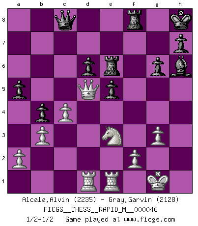Last move : 1/2-1/2 2011 November 17 16:45:32 [Event "FICGS__CHESS__RAPID_M__000046"] [Site "FICGS"] [Date "2011.08.31"] [Round "1"] [White "Alcala,Alvin"] [Black "Gray,Garvin"] [Result "1/2-1/2"] [WhiteElo "2235"] [BlackElo "2128"] 1.e4 c5 2.Nf3 Nc6 3.d4 cxd4 4.Nxd4 Nf6 5.Nc3 e5 6.Ndb5 d6 7.Bg5 a6 8.Na3 b5 9.Nd5 Be7 10.Bxf6 Bxf6 11.c4 b4 12.Nc2 O-O 13.g3 Rb8 14.b3 Be6 15.h4 a5 16.Bg2 Bxd5 17.exd5 Ne7 18.O-O Qb6 19.Re1 g6 20.Rc1 Rb7 21.Qd3 Bg7 22.Qe3 Qc7 23.h5 Nf5 24.Qd3 Bh6 25.Ra1 Ng7 26.hxg6 fxg6 27.Bh3 Qc5 28.Ne3 Kh8 29.Be6 Re7 30.Rad1 Nxe6 31.dxe6 Rxe6 32.Qd5 Qc8 1/2-1/2 Sicilian : Pelikan (Lasker/Sveshnikov) variation Kingside Castling by player Black (move 12) Kingside Castling by player White (move 18) This chess game ended in a draw. Follow this game move after move (download)Fischer, who may or may not be mad as a hatter, has every right to be horrified. (Jeremy Silman) Ich war schon mal beim Dopingtest. Da musste ich Urin abgeben, während Dritte zusahen. (Elisabeth Pähtz) Fischer deseaba darle a los Rusos una sopa de su propia medicina. (Larry Evans) Nous sommes les pions de la mystérieuse partie d'Echecs jouée par Dieu. Il nous déplace, nous arrête, nous pousse encore, puis nous lance un à un dans la boîte du Néant. Epitaphe sur la tombe de David Janowsky (1868-1927). A computer lets you make more mistakes faster than any invention in human history - with the possible exceptions of handguns and tequila. (Mitch Ratcliffe)