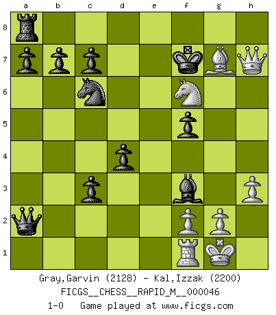 Last move : 1-0 2011 November 2 22:5:56 [Event "FICGS__CHESS__RAPID_M__000046"] [Site "FICGS"] [Date "2011.08.31"] [Round "1"] [White "Gray,Garvin"] [Black "Kal,Izzak"] [Result "1-0"] [WhiteElo "2128"] [BlackElo "2200"] 1.e4 e5 2.Nf3 Nc6 3.Bc4 Bc5 4.b4 Bxb4 5.c3 Ba5 6.d4 exd4 7.O-O Nf6 8.e5 d5 9.exf6 dxc4 10.fxg7 Rg8 11.Re1+ Be6 12.Bg5 Qd5 13.Nbd2 Rxg7 14.Ne4 Kf8 15.Bh6 Bg4 16.h3 f5 17.Nf6 Bxf3 18.Qb1 Kf7 19.Bxg7 Qc5 20.Qc1 Bxc3 21.Qh6 Bxe1 22.Rxe1 Qa5 23.Rb1 Qxa2 24.Rf1 c3 25.Qxh7 1-0 Evans gambit Kingside Castling by player White (move 7) Player White won this chess game. Follow this game move after move (download)Chess is ruthless: you've got to be prepared to kill people. (Nigel Short) Kein Schachspieler kann gut schlafen. (H. G. Wells) La esencia del Ajedrez es pensar acerca de lo que el Ajedrez es. (David Bronstein) Aux échecs, l'amour-propre est satisfait quand on remporte la victoire, mais il n'y a pas de honte à être battu. (Benjamin Franklin) You think that education is too expensive ? Try ignorance. (Derek Bok)