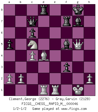 Last move : 1/2-1/2 2011 October 23 17:9:3 [Event "FICGS__CHESS__RAPID_M__000046"] [Site "FICGS"] [Date "2011.08.31"] [Round "1"] [White "Clement,George"] [Black "Gray,Garvin"] [Result "1/2-1/2"] [WhiteElo "2276"] [BlackElo "2128"] 1.e4 c5 2.Nf3 Nc6 3.Bb5 e6 4.O-O Nge7 5.Re1 a6 6.Bf1 d6 7.c3 g6 8.d4 cxd4 9.Nxd4 Bg7 10.Nxc6 bxc6 11.Bf4 e5 12.Be3 f5 13.Nd2 fxe4 14.Nxe4 d5 15.Nc5 O-O 16.f3 a5 17.Qc2 Rf7 18.Bf2 Qc7 19.Rad1 g5 20.Bd3 g4 21.Bxh7+ Kh8 22.Bg6 Nxg6 23.Qxg6 gxf3 24.gxf3 Kg8 25.Qg2 Bf5 26.c4 d4 27.f4 exf4 28.Bxd4 f3 29.Qg5 Rd8 1/2-1/2 Sicilian : Nimzovich-Rossolimo attack (without ...d6) Kingside Castling by player White (move 4) Kingside Castling by player Black (move 15) This chess game ended in a draw. Follow this game move after move (download)We like to think. (Gary Kasparov) Das Schach hält seine Meister in eigenen Banden, Fesseln; auf vielerlei Weise formt es ihren Geist, so dass die innere Freiheit selbst des Stärksten beeinflusst wird. (Albert Einstein) La caracteristica mas importante en la posición del Ajedrez es la actividad de las piezas. Esto es absolutamente fundamental en todas las fases del juego: Apertura, Juego Medio y especialmente Finales. La limitación primordial en la actividad de una pieza, es la estructuración de los Peones. (Michael Stean) Horreur, mais aussi harmonie suprême : qu'y avait-il en effet au monde en dehors des échecs ? Le brouillard, l'inconnu, le non-être... (Vladimir Nabokov) The real voyage of discovery consists not in seeking new lands but in seeing with new eyes. (Marcel Proust)