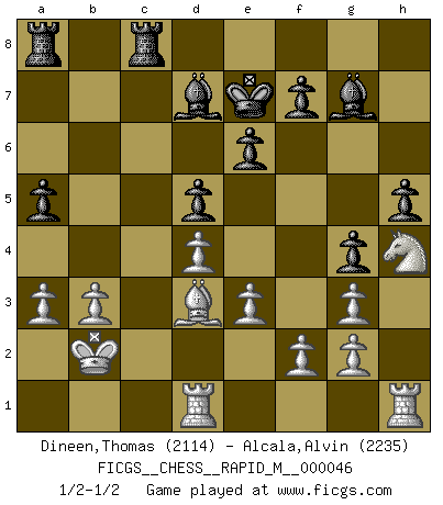 Last move : 1/2-1/2 2011 November 8 13:52:16 [Event "FICGS__CHESS__RAPID_M__000046"] [Site "FICGS"] [Date "2011.08.31"] [Round "1"] [White "Dineen,Thomas"] [Black "Alcala,Alvin"] [Result "1/2-1/2"] [WhiteElo "2114"] [BlackElo "2235"] 1.d4 Nf6 2.c4 c6 3.Nc3 d5 4.Nf3 a6 5.c5 Nbd7 6.Bf4 Nh5 7.Bd2 Nhf6 8.Qc2 g6 9.Bg5 Bg7 10.e3 h6 11.Bh4 g5 12.Bg3 Nh5 13.O-O-O Nxg3 14.hxg3 g4 15.Nh4 e6 16.Be2 h5 17.Na4 b6 18.cxb6 Nxb6 19.Qxc6+ Bd7 20.Qxb6 Bxa4 21.Qxd8+ Kxd8 22.b3 Bd7 23.Kb2 a5 24.a3 Ke7 25.Bd3 Rhc8 1/2-1/2 Queen's pawn game Queenside Castling by player White (move 13) This chess game ended in a draw. Follow this game move after move (download)I prefer to lose a really good game than to win a bad one. (David Levy) Die Partien sind immer verschieden, die Interviews immer die gleichen. (Garry Kasparov) El Ajedrez es un cuento de Hadas de las 1001 metidas de pata. (Savielly Tartakower) Mon pion favori sur ma case favorite ! Bronstein en parlant d'un coup de pion en h5 quand il avait les Noirs. You can think I'm wrong, but that's no reason to quit thinking. (Gregory House, House M.D.)