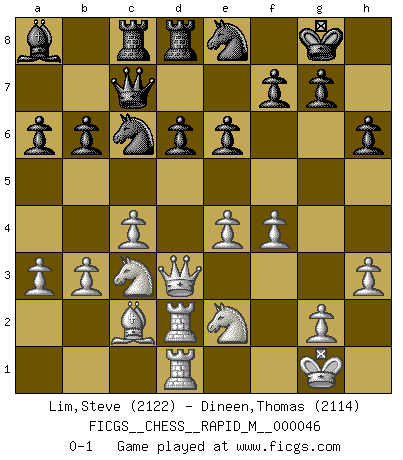 Last move : 0-1 2011 December 18 9:31:13 [Event "FICGS__CHESS__RAPID_M__000046"] [Site "FICGS"] [Date "2011.08.31"] [Round "1"] [White "Lim,Steve"] [Black "Dineen,Thomas"] [Result "0-1"] [WhiteElo "2122"] [BlackElo "2114"] 1.d4 Nf6 2.c4 e6 3.Nf3 Bb4+ 4.Bd2 Qe7 5.a3 Bxd2+ 6.Qxd2 b6 7.Nc3 Bb7 8.Qg5 O-O 9.e4 h6 10.Qe3 d6 11.Bd3 Nbd7 12.Rd1 c5 13.O-O Rfd8 14.h3 cxd4 15.Nxd4 Ne5 16.b3 Nc6 17.Nde2 Qc7 18.Rd2 Rac8 19.Rfd1 a6 20.f4 Na5 21.Bc2 Ne8 22.Kh2 Bc6 23.Qd3 Ba8 24.Qe3 Rb8 25.Qd3 Rbc8 26.Kg1 Nc6 0-1 Bogo-Indian defense, Nimzovich variation Kingside Castling by player Black (move 8) Kingside Castling by player White (move 13) Player Black won this chess game. Follow this game move after move (download)I'd rather have a Pawn than a finger. (Reuben Fine) Obwohl ich alt bin, darf mir niemand den Finger in den Mund stecken, sonst beisse ich. (Wilhelm Steinitz) Bendita sea la memoria de aquel que dio al mundo este juego inmortal. (A. G. Gardiner) Tous ces prétendus hommes politiques sont les pions, les Cavaliers, les Tours ou les Fous d'une partie d'échecs qui se jouera tant qu'un hasard ne renversera pas l'échiquier. (Honoré de Balzac) A specialist learns more and more about less and less until he knows everything about nothing. (Nicholas Murray Butler)