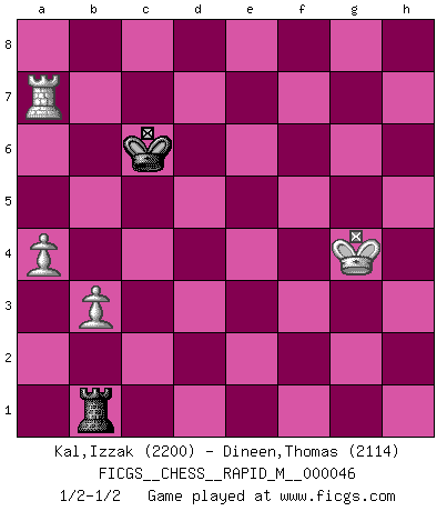Last move : 1/2-1/2 2012 January 1 5:45:6 [Event "FICGS__CHESS__RAPID_M__000046"] [Site "FICGS"] [Date "2011.08.31"] [Round "1"] [White "Kal,Izzak"] [Black "Dineen,Thomas"] [Result "1/2-1/2"] [WhiteElo "2200"] [BlackElo "2114"] 1.e4 e6 2.d4 d5 3.Nd2 c5 4.Ngf3 Nf6 5.exd5 exd5 6.Bb5+ Bd7 7.Bxd7+ Nbxd7 8.O-O Be7 9.dxc5 Nxc5 10.Nb3 Nce4 11.Nfd4 O-O 12.Nf5 Re8 13.Nxe7+ Qxe7 14.Be3 Qc7 15.Bd4 Nd7 16.Re1 Re6 17.f3 Rh6 18.fxe4 Qxh2+ 19.Kf2 Qh4+ 20.Ke2 Rg6 21.Kd2 Qf4+ 22.Be3 Qxe4 23.Kc1 Rxg2 24.a4 h5 25.Ra3 Re8 26.Nd2 Qg4 27.Rh1 d4 28.Bxd4 Qxd4 29.Rd3 Qg4 30.Qxg4 hxg4 31.Rxd7 f5 32.c4 f4 33.Rh5 R8e2 34.Rg5 Kh8 35.R5xg7 Rxd2 36.Rh7+ Kg8 37.Rdg7+ Kf8 38.Rxb7 Kg8 39.Rhg7+ Kf8 40.Rgf7+ Kg8 41.Rxf4 Rdf2 42.Rxf2 Rxf2 43.Rb3 Rf1+ 44.Kd2 Rf2+ 45.Ke1 Rc2 46.c5 Rxc5 47.Rb4 Rc1+ 48.Kf2 Kf7 49.Kg3 Rg1+ 50.Kf4 Ke6 51.b3 Kd6 52.Rb7 Kc6 53.Rxa7 Rb1 54.Kxg4 1/2-1/2 French : Tarrasch, Open variation Kingside Castling by player White (move 8) Kingside Castling by player Black (move 11) 10 pieces endgame at move 42 : White KRRPPP , Black KRPP WHITE : King + 2 Rooks 3 Pawns BLACK : King + 1 Rook 2 Pawns 9 pieces endgame at move 42 : White KRPPP , Black KRPP WHITE : King + 1 Rook 3 Pawns BLACK : King + 1 Rook 2 Pawns 8 pieces endgame at move 46 : White KRPP , Black KRPP WHITE : King + 1 Rook 2 Pawns BLACK : King + 1 Rook 2 Pawns 7 pieces endgame at move 53 : White KRPP , Black KRP WHITE : King + 1 Rook 2 Pawns BLACK : King + 1 Rook 1 Pawn 6 pieces endgame at move 54 : White KRPP , Black KR WHITE : King + 1 Rook 2 Pawns BLACK : King + 1 Rook This chess game ended in a draw. Follow this game move after move (download)Before the endgame, the Gods have placed the middle game. (Siegbert Tarrasch) Ich verstehe mehr vom Schach als irgendein anderer lebender Meister. (José Raúl Capablanca) El Ajedrez, como la música, como el amor, tiene el poder de hacer feliz a la gente. (Siegbert Tarrasch) Les pièces de l'échiquier étaient impitoyables. Elles le retenaient, elles l'absorbaient. Il y avait de l'horreur en cela, mais aussi une harmonie unique. Car, qu'y a-t-il dans le monde, à part les échecs ? (V. Nabokov) Thus, what is of supreme importance in war is to attack the enemy's strategy. (Sun Tzu)