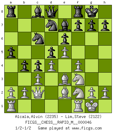 Last move : 1/2-1/2 2011 November 17 15:55:46 [Event "FICGS__CHESS__RAPID_M__000046"] [Site "FICGS"] [Date "2011.08.31"] [Round "1"] [White "Alcala,Alvin"] [Black "Lim,Steve"] [Result "1/2-1/2"] [WhiteElo "2235"] [BlackElo "2122"] 1.e4 e6 2.d4 d5 3.Nc3 Nf6 4.e5 Nfd7 5.f4 c5 6.Nf3 Nc6 7.Be3 a6 8.Qd2 Be7 9.Be2 O-O 10.O-O b5 11.Nd1 b4 12.Nf2 c4 13.c3 a5 14.Qc2 1/2-1/2 French : Steinitz, Boleslavsky variation Kingside Castling by player Black (move 9) Kingside Castling by player White (move 10) This chess game ended in a draw. Follow this game move after move (download)Chess is really ninety nine percent calculation. (Soltis) Gott hat gewollt, dass ich Champion werde. (Surab Azmajparaschvili) Aquellos que dicen entender al Ajedrez, no entienden nada. (Robert Hubner) Des idées, des idées, j'en ai cent, j'en ai mille. Des bonnes, des mauvaises, applicables, irréalisables... Il suffit de faire le tri ! (Roos) Experiences are the keys to life. (Daniel Parmet)