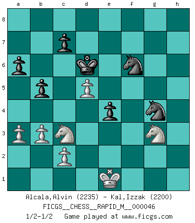 Last move : 1/2-1/2 2011 December 28 3:4:38 [Event "FICGS__CHESS__RAPID_M__000046"] [Site "FICGS"] [Date "2011.08.31"] [Round "1"] [White "Alcala,Alvin"] [Black "Kal,Izzak"] [Result "1/2-1/2"] [WhiteElo "2235"] [BlackElo "2200"] 1.e4 e5 2.f4 exf4 3.Bc4 Qh4+ 4.Kf1 d6 5.Nf3 Qf6 6.d4 Be6 7.Bd3 g5 8.Nc3 g4 9.Ng1 Ne7 10.d5 Bd7 11.h3 h5 12.hxg4 Bxg4 13.Be2 Nd7 14.Bxg4 hxg4 15.Rxh8 Qxh8 16.Qxg4 Bg7 17.Bd2 O-O-O 18.Qh3 Be5 19.Qxh8 Rxh8 20.Re1 f5 21.Nge2 Nf6 22.exf5 Rh4 23.Kf2 Nxf5 24.a3 a6 25.Kf3 Rg4 26.Kf2 b5 27.Rh1 Kd7 28.b3 Nh4 29.Bxf4 Rxg2+ 30.Kf1 Rg4 31.Bxe5 dxe5 32.Rh3 e4 33.Rg3 Nf5 34.Rxg4 Ne3+ 35.Ke1 Nexg4 36.Ng3 Kd6 1/2-1/2 KGA : Bishop's gambit Queenside Castling by player Black (move 17) This chess game ended in a draw. Follow this game move after move (download)Chess is in its essence a game, in its form an art, and in its execution a science. (Baron Tassilo) Nur ein wirklich starker Spieler weiß wie schwach er spielt. (Savielly Grigorievitsch Tartakower) Cuando estes solo, cuando te sientas un extraño en el mundo, juega al Ajedrez. Esto levantará tu espiritu y será tu consejero de guerra. (Aristóteles) Les Echecs sont affaire de jugement sensible. Savoir quand frapper et quand esquiver. (Fischer) History is the quarrels of popes and kings, with wars or pestilences in every page; the men all so good for nothing, and hardly any women at all. (Jane Austen)
