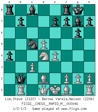 Last move : 1/2-1/2 2011 December 14 5:27:12 [Event "FICGS__CHESS__RAPID_M__000046"] [Site "FICGS"] [Date "2011.08.31"] [Round "1"] [White "Lim,Steve"] [Black "Bernal Varela,Nelson"] [Result "1/2-1/2"] [WhiteElo "2122"] [BlackElo "2206"] 1.d4 Nf6 2.c4 g6 3.Nc3 d5 4.Bf4 Bg7 5.Nf3 O-O 6.e3 c5 7.dxc5 Ne4 8.Rc1 Nd7 9.cxd5 Qa5 10.Nd4 Nxc3 11.bxc3 Qxa2 12.Nb3 a5 13.e4 Qb2 14.Bd2 a4 15.Nd4 Nxc5 16.Rb1 1/2-1/2 King's Indian defense, 3.Nc3 Kingside Castling by player Black (move 5) This chess game ended in a draw. Follow this game move after move (download)When you don't know what to play, wait for an idea to come into your opponent's mind. You may be sure that idea will be wrong. (Siegbert Tarrasch) Es gibt nur zwei wahre Schachgenies - das andere war Wilhelm Steinitz, der Weltmeister von 1872 bis 1894. (Robert James Fischer) El ganar no lo es todo... pero el perder es nada. (Mednis) Il n'y a pas de prix trop élevé au scalp de l'ennemi. (Koblentz) You know what they say : You lie down with the Devil, you wake up in Hell. (Horatio Caine, C.S.I. Miami)