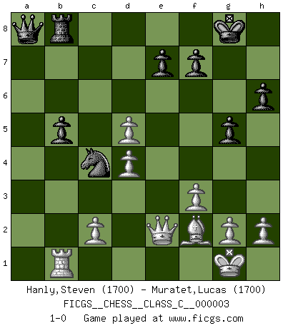 Last move : 1-0 2006 August 1 3:19:25 [Event "FICGS__CHESS__CLASS_C__000003"] [Site "FICGS"] [Date "2006.05.06"] [Round "1"] [White "Hanly,Steven"] [Black "Muratet,Lucas"] [Result "1-0"] [WhiteElo "1700"] [BlackElo "1700"] 1.e4 c5 2.Nf3 d6 3.d4 cxd4 4.Nxd4 Nf6 5.Nc3 a6 6.Be3 Ng4 7.Bc1 Nf6 8.Be3 Ng4 9.Bg5 h6 10.Bh4 g5 11.Bg3 Bg7 12.Qd2 Nc6 13.Nb3 Be6 14.f3 Nge5 15.Bf2 Bc4 16.Be2 b5 17.a4 Bxe2 18.Qxe2 Nc4 19.axb5 Bxc3+ 20.bxc3 axb5 21.O-O O-O 22.Nd4 Nxd4 23.cxd4 d5 24.Rxa8 Qxa8 25.Rb1 Rb8 26.exd5 1-0 Sicilian : Najdorf, Byrne (English) attack Kingside Castling by player White (move 21) Kingside Castling by player Black (move 21) Player White won this chess game. Follow this game move after move (download)No one ever won a game by resigning. (Unknown) Ich verstehe den Grund nicht, warum die Aufteilung in Frauen und Männer überhaupt im Schach besteht. (Judith Polgar) Bobby es la celebridad menos entendida y malinterpretada que camina el la faz de esta tierra. (Yasser Seirawan) Le génie consiste à savoir transgresser les règles au moment opportun. (Teichmann) Industry executives and analysts often mistakenly talk about strategy as if it were some kind of chess match. But in chess, you have just two opponents, each with identical resources, and with luck playing a minimal role. The real world is much more like a poker game, with multiple players trying to make the best of whatever hand fortune has dealt them. In our industry, Bill Gates owns the table until someone proves otherwise. (David Moschella, 'Computerworld')