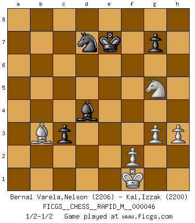 Last move : 1/2-1/2 2012 January 1 2:10:48 [Event "FICGS__CHESS__RAPID_M__000046"] [Site "FICGS"] [Date "2011.08.31"] [Round "1"] [White "Bernal Varela,Nelson"] [Black "Kal,Izzak"] [Result "1/2-1/2"] [WhiteElo "2206"] [BlackElo "2200"] 1.e4 e5 2.Nf3 Nc6 3.Bb5 a6 4.Ba4 Nf6 5.O-O d6 6.c3 Be7 7.d4 b5 8.Bc2 O-O 9.h3 Bb7 10.a3 Re8 11.Be3 Nb8 12.Nbd2 Nbd7 13.a4 Bf8 14.Qb1 h6 15.Re1 Nb6 16.b3 bxa4 17.bxa4 Rb8 18.a5 Nbd7 19.Qa2 exd4 20.cxd4 Nxe4 21.Nxe4 Bxe4 22.Bg5 hxg5 23.Rxe4 Rxe4 24.Bxe4 Nf6 25.Bd3 d5 26.Bxa6 c5 27.Bf1 c4 28.a6 Ra8 29.a7 Qc7 30.Qa5 Bd6 31.g3 Qxa5 32.Rxa5 Bc7 33.Ra6 Nd7 34.Bg2 Bb6 35.Nxg5 Rxa7 36.Rxa7 Bxa7 37.Bxd5 c3 38.Bxf7+ Kf8 39.Bb3 Ke7 40.Kf1 Bxd4 1/2-1/2 Ruy Lopez : Steinitz defense deferred (Russian defense) Kingside Castling by player White (move 5) Kingside Castling by player Black (move 8) This chess game ended in a draw. Follow this game move after move (download)I have always a slight feeling of pity for the man who has no knowledge of Chess. (Siegbert Tarrasch) Das ganze Leben mit einer Ehefrau ist wie ein Endspiel mit ungleichfarbigen Läufern. (Viktor Kortschnoi) El Jaque al descubierto es el bombardero del tablero. (Reuben Fine) Je ne crois pas en la psychologie, je crois aux bons coups. (Robert Fischer) We need strong personalities and only one world champion to attract sponsors. (Anatoly Karpov)