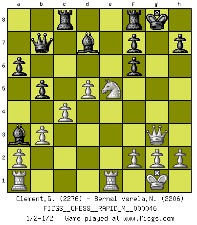 Last move : 1/2-1/2 2011 October 20 4:22:27 [Event "FICGS__CHESS__RAPID_M__000046"] [Site "FICGS"] [Date "2011.08.31"] [Round "1"] [White "Clement,George"] [Black "Bernal Varela,Nelson"] [Result "1/2-1/2"] [WhiteElo "2276"] [BlackElo "2206"] 1.e4 c5 2.Nf3 d6 3.Bb5+ Nd7 4.d4 cxd4 5.Qxd4 a6 6.Bxd7+ Bxd7 7.O-O e5 8.Qd3 Rc8 9.c4 Qc7 10.b3 b5 11.Na3 Qb7 12.Re1 Nf6 13.Bg5 d5 14.exd5 Bxa3 15.Nxe5 O-O 16.Bxf6 gxf6 17.Qg3+ 1/2-1/2 Sicilian : Canal-Sokolsky (Nimzovich-Rossolimo, Moscow) attack Kingside Castling by player White (move 7) Kingside Castling by player Black (move 15) This chess game ended in a draw. Follow this game move after move (download)I still hope to kill Fischer. (Boris Spassky) Irgendwie scheint mir sonntags früh um 9 Uhr der Killerinstinkt verloren gegangen zu sein. (Alexej Shirov) Los Peones son nacidos libres, y aún así, se encuentran por doquier encadenados. (Rick Kennedy) Si rien de grave n'est détecté lors de l'analyse d'une position, on joue alors le coup. Seconde règle de Blumenfeld. It's not a bug - it's an undocumented feature. (Anonymous)