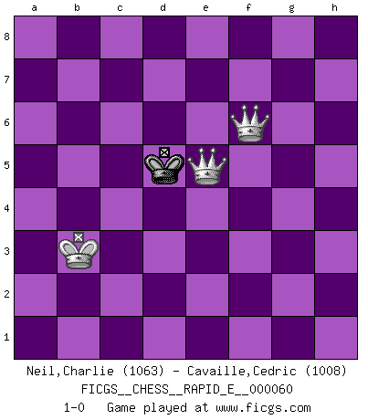 Last move : 1-0 2011 October 29 22:12:14 [Event "FICGS__CHESS__RAPID_E__000060"] [Site "FICGS"] [Date "2011.09.01"] [Round "1"] [White "Neil,Charlie"] [Black "Cavaille,Cedric"] [Result "1-0"] [WhiteElo "1063"] [BlackElo "1008"] 1.e4 c5 2.Nc3 d6 3.Nge2 e6 4.d4 cxd4 5.Nxd4 Nf6 6.g4 d5 7.g5 Nfd7 8.exd5 exd5 9.Nxd5 Nc6 10.Nxc6 bxc6 11.Nc3 Be7 12.h4 f6 13.Qe2 fxg5 14.Bxg5 h6 15.Bxe7 Qxe7 16.Qxe7+ Kxe7 17.O-O-O a5 18.Bh3 g5 19.hxg5 hxg5 20.Rhe1+ Kd8 21.Na4 Rxh3 22.Nb6 Rb8 23.Nxc8 Kxc8 24.Re8+ Kc7 25.Rxb8 Nxb8 26.b3 Nd7 27.Rg1 Ne5 28.Rxg5 Rh1+ 29.Kb2 Re1 30.f4 Nf3 31.Rxa5 Re2 32.f5 Kd6 33.f6 Ng5 34.Rxg5 Ke6 35.Rc5 Kd6 36.f7 Rf2 37.f8Q+ Rxf8 38.Rh5 Re8 39.Rh6+ Kd5 40.a4 c5 41.Rh5+ Kd4 42.c3+ Kd3 43.Rh3+ Kd2 44.a5 Ra8 45.b4 cxb4 46.cxb4 Ke2 47.Kb3 Rd8 48.Rc3 Rd3 49.Rxd3 Kxd3 50.a6 Kd4 51.a7 Kd5 52.a8Q+ Kd6 53.b5 Kc5 54.Qc6+ Kd4 55.Qf6+ Ke4 56.b6 Kd5 57.b7 Kc5 58.b8Q Kd5 59.Qb8e5+ 1-0 Sicilian : Closed Queenside Castling by player White (move 17) 10 pieces endgame at move 31 : White KRPPPP , Black KRNP WHITE : King + 1 Rook 4 Pawns BLACK : King + 1 Rook 1 Knight 1 Pawn 9 pieces endgame at move 34 : White KRPPPP , Black KRP WHITE : King + 1 Rook 4 Pawns BLACK : King + 1 Rook 1 Pawn Promotion Queen by player White (move 37) 8 pieces endgame at move 37 : White KRPPP , Black KRP WHITE : King + 1 Rook 3 Pawns BLACK : King + 1 Rook 1 Pawn 7 pieces endgame at move 45 : White KRPP , Black KRP WHITE : King + 1 Rook 2 Pawns BLACK : King + 1 Rook 1 Pawn 6 pieces endgame at move 46 : White KRPP , Black KR WHITE : King + 1 Rook 2 Pawns BLACK : King + 1 Rook 5 pieces endgame at move 49 : White KRPP , Black K WHITE : King + 1 Rook 2 Pawns BLACK : King + 4 pieces endgame at move 49 : White KPP , Black K WHITE : King + 2 Pawns BLACK : King + Promotion Queen by player White (move 52) Promotion Queen by player White (move 58) Player White won this chess game. Follow this game move after move (download)Fischer is under obligation to nobody. (Joseph Platz) Man gibt nur Pakete auf. (Paul Keres) Alekhine es un poeta que crea un trabajo de arte de algo que raramente inspiraría a otra persona a mandar una tarjeta postal. (Max Euwe) Nous vivons dans un monde échiquéen : chaque jour qui passe est un défi à relever. (Philosophe Sasha) Ah, the Socrating method. The best way we have of teaching everything-apart from juggling chainsaws. (Gregory House, House M.D.)