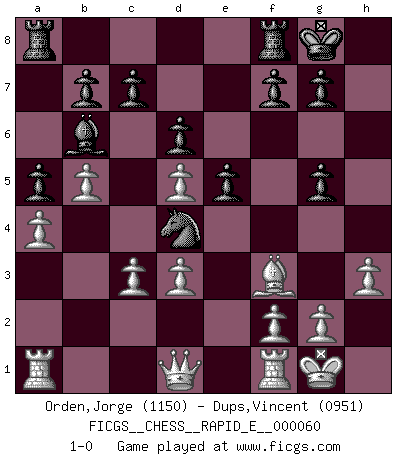 Last move : 1-0 2011 October 3 19:50:12 [Event "FICGS__CHESS__RAPID_E__000060"] [Site "FICGS"] [Date "2011.09.01"] [Round "1"] [White "Orden,Jorge"] [Black "Dups,Vincent"] [Result "1-0"] [WhiteElo "1150"] [BlackElo "0951"] 1.e4 e5 2.Nf3 Nc6 3.Nc3 Nf6 4.Be2 Bb4 5.d3 d6 6.O-O O-O 7.Bd2 Bg4 8.a3 Ba5 9.h3 Bxf3 10.Bxf3 Nd4 11.b4 Bb6 12.a4 a5 13.b5 h6 14.Nd5 Nxd5 15.exd5 Qg5 16.Bxg5 hxg5 17.c3 1-0 Four knights game Kingside Castling by player White (move 6) Kingside Castling by player Black (move 6) Player White won this chess game. Follow this game move after move (download)Chess is a part of culture and if a culture is declining then Chess too will decline. (Mikhail Botvinnik) Es gibt Leute, die glauben, alles wäre vernünftig, was man mit einem ernsthaften Gesicht tut. (Georg Christoph Lichtenberg) Si un gobernante no entiende al Ajedrez, ¿como puede governar él un reinado?. (El Rey Khusros II) L'attaque fait le spectacle, la défense gagne les matchs. (Dicton footballistique) Big Chess is a place for big hallucinations. (Thibault de Vassal)