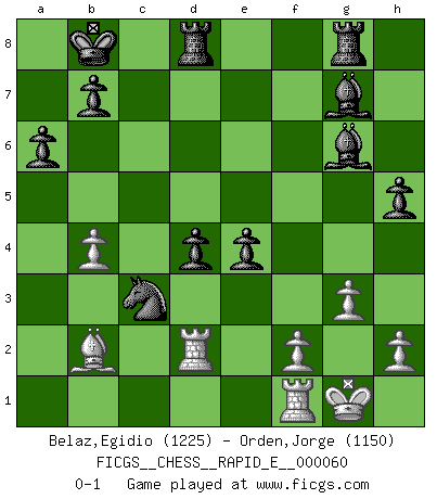 Last move : 0-1 2011 October 18 21:57:19 [Event "FICGS__CHESS__RAPID_E__000060"] [Site "FICGS"] [Date "2011.09.01"] [Round "1"] [White "Belaz,Egidio"] [Black "Orden,Jorge"] [Result "0-1"] [WhiteElo "1225"] [BlackElo "1150"] 1.e4 c5 2.Bc4 Nc6 3.Nf3 d6 4.O-O g6 5.Bb5 Bg7 6.c3 Qc7 7.d4 a6 8.Bxc6+ Qxc6 9.d5 Qb6 10.Na3 e5 11.Nc4 Qc7 12.Ng5 h6 13.Nf3 Ne7 14.Be3 f5 15.exf5 Bxf5 16.Nh4 O-O-O 17.b4 cxb4 18.cxb4 Kb8 19.Rc1 Qd7 20.Nb6 Qb5 21.a3 Be4 22.Qb3 Nxd5 23.Nxg6 Nxb6 24.a4 Qxa4 25.Qxa4 Nxa4 26.Nh4 d5 27.Ng6 Bxg6 28.Ra1 Nc3 29.Ra3 Nb5 30.Ra2 d4 31.Bc1 Nc3 32.Rd2 e4 33.g3 h5 34.Bb2 Rhg8 0-1 Sicilian defense Kingside Castling by player White (move 4) Queenside Castling by player Black (move 16) Player Black won this chess game. Follow this game move after move (download)The enormous mental resilience, without which no Chess player can exist, was so much taken up by Chess that he could never free his mind of this game. (Albert Einstein) Mein erstes Ziel war nicht, die Partie zu gewinnen, sondern eine Figur zu opfern. -- der junge (Wilhelm Steinitz) No hay otro maestro que tenga una voluntad terrífica de ganar. Al tablero, el irradía peligro y aún los oponentes mas fuertes tienden a congelarse como liebres cuando olfatean a una pantera. Aún sus debilidades son peligrosas. Con las blancas, su juego de apertura es predecible - te es posible hacer planes en su contra - pero es tan fuerte que tus planes casi nunca funcionan. En el juego medio, su precisión e invención son fabulosas y en finales, tú simplemente no le puedes vencer. (Experto Alemán anónimo) Le thème de l'attaque double intervient d'une manière ou d'une autre dans l'immense majorité des combinaisons. (Youri Averbakh) The hypothalamus is one of the most important parts of the brain, involved in many kinds of motivation, among other functions. The hypothalamus controls the 'Four Fs: Fighting, Fleeing, Feeding and Mating. (Unknown author)