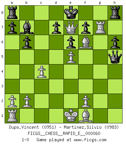 Last move : 1-0 2011 October 22 17:56:56 [Event "FICGS__CHESS__RAPID_E__000060"] [Site "FICGS"] [Date "2011.09.01"] [Round "1"] [White "Dups,Vincent"] [Black "Martinez,Silvio"] [Result "1-0"] [WhiteElo "0951"] [BlackElo "0983"] 1.c4 c5 2.Nf3 Nc6 3.d4 cxd4 4.Nxd4 Nxd4 5.Qxd4 Nf6 6.Nc3 e6 7.e4 Bb4 8.e5 Nh5 9.g4 Bxc3+ 10.Qxc3 Qh4 11.Rg1 Qxh2 12.Rg2 Qh4 13.gxh5 Qxh5 14.Rxg7 b6 15.Bg5 h6 16.Bf6 Ba6 17.Qa3 Bb7 18.Qe7+ 1-0 English : Symmetrical variation Player White won this chess game. Follow this game move after move (download)Chess is a terrible game. If you have no center, your opponent has a freer position. If you do have a center, then you really have something to worry about ! (Siegbert Tarrasch) Wie ich sie so einen nach dem anderen nieder mähte wurde meine Überlegenheit offensichtlich. (José Raúl Capablanca) Algunos sacrificios son sólidos, los demás son míos. (Mikhail Tal) D'abord les bases : Jouez et étudiez, puis étudiez et jouez, ensuite jouez et étudiez, puis étudiez et jouez. Deuxièmement : Donnez toujours le meilleur de vous-même ! (Ken Smith) The bottom line is always the bottom line. (Johann Piek)