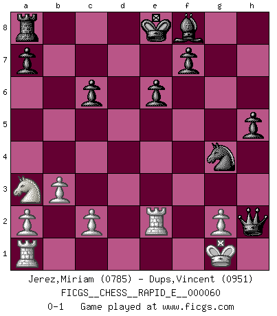 Last move : 0-1 2011 November 13 4:54:2 [Event "FICGS__CHESS__RAPID_E__000060"] [Site "FICGS"] [Date "2011.09.01"] [Round "1"] [White "Jerez,Miriam"] [Black "Dups,Vincent"] [Result "0-1"] [WhiteElo "0785"] [BlackElo "0951"] 1.e4 c5 2.Na3 Nc6 3.Nf3 g6 4.Bc4 Nf6 5.O-O Nxe4 6.d3 Nf6 7.Ng5 d5 8.Bb5 Bg4 9.Qd2 h6 10.Bxc6+ bxc6 11.f3 hxg5 12.fxg4 Nxg4 13.Qxg5 Nxh2 14.Rf2 Qd7 15.Bf4 Ng4 16.Re2 Rh5 17.Qxh5 gxh5 18.b3 c4 19.dxc4 e6 20.cxd5 Qxd5 21.Rd2 Qe4 22.Bg3 Qe3+ 23.Rf2 Qxg3 24.Re2 Qh2+ 0-1 Sicilian defense Kingside Castling by player White (move 5) Player Black won this chess game. Follow this game move after move (download)Best by test: 1. e4 (Bobby Fischer) Oft bringt ein stiller Zug das Erdbeben. (Richard Reti) Un juego de Ajedrez es un dialogo, una conversación entre un jugador y su oponente. Cada movimiento del oponente puede contener amenazas o tropiezos, pero un jugador no se puede defender de las amenazas o tomar ventaja de los tropiezos si es que no se pregunta a sí mismo: ¿Que es lo que mi oponente va a hacer después de cada movida?. (Bruce A. Moon) Les Echecs sont et restent toujours un combat, un combat intégral comme la boxe, la lutte ou un autre sport, et où il doit y avoir un vainqueur et un vaincu. (Joseph Emil Diemer) A good teacher is like a candle - it consumes itself to light the way for others. (Author unknown)