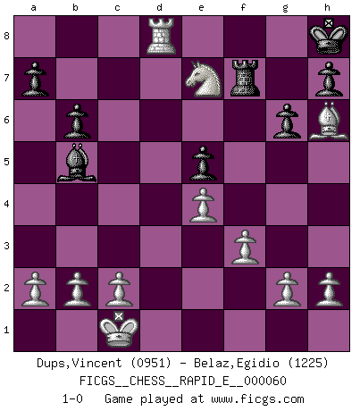 Last move : 1-0 2011 October 10 19:13:7 [Event "FICGS__CHESS__RAPID_E__000060"] [Site "FICGS"] [Date "2011.09.01"] [Round "1"] [White "Dups,Vincent"] [Black "Belaz,Egidio"] [Result "1-0"] [WhiteElo "0951"] [BlackElo "1225"] 1.e4 c5 2.Nf3 d6 3.d4 Nf6 4.Nc3 cxd4 5.Nxd4 g6 6.Be3 Bg7 7.f3 O-O 8.Qd2 b6 9.O-O-O e5 10.Ndb5 Ne8 11.Qd5 Nc7 12.Nxc7 Qxc7 13.Qxa8 Ba6 14.Nd5 Qb7 15.Qxb7 Bxb7 16.Ne7+ Kh8 17.Rxd6 Re8 18.Bb5 Rf8 19.Rhd1 Bf6 20.Rxf6 Ba6 21.Bh6 Nd7 22.Rxd7 Bxb5 23.Rxf7 Rxf7 24.Rd8+ 1-0 Sicilian Kingside Castling by player Black (move 7) Queenside Castling by player White (move 9) Player White won this chess game. Follow this game move after move (download)Chess, like any creative activity, can exist only through the combined efforts of those who have creative talent, and those who have the ability to organize their creative work. (Mikhail Botvinnik) Wenn du nicht weißt was du tun sollst, warte bis dein Gegner eine Idee hat. Sie wird sicher schlecht sein. (Siegbert Tarrasch) El Ajedrez es un invernadero donde los frutos del carácter pueden madurar mas completamente que en la vida. (Edward Morgan Foster) J'ai toujours senti une vague pitié pour l'homme qui ne connaît rien aux échecs, tout comme j'en aurais pour un homme ignorant de l'amour. Les Echecs, comme la musique ou comme l'amour, ont le pouvoir de rendre heureux. (Siegbert Tarrasch) Life is verb, not a noun. (Charlotte Perkins Gilman)