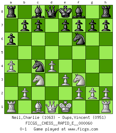 Last move : 0-1 2011 September 25 12:34:55 [Event "FICGS__CHESS__RAPID_E__000060"] [Site "FICGS"] [Date "2011.09.01"] [Round "1"] [White "Neil,Charlie"] [Black "Dups,Vincent"] [Result "0-1"] [WhiteElo "1063"] [BlackElo "0951"] 1.d4 d5 2.c4 dxc4 3.Nc3 a6 4.a4 Nc6 5.e3 Na5 6.Nf3 Nf6 7.Bxc4 Nxc4 0-1 Queen's gambit accepted Player Black won this chess game. Follow this game move after move (download)The Pin is mightier than the sword. (Fred Reinfeld) Ich tröste mich mit dem Vergnügen, daß Schachfans, Zuschauer und Leser glücklich sind, wenn ein Großmeister etwas riskiert, statt nur Klötzchen zu schieben. (Mikhail Nekhemyevich Tal) En partidas rápidas, el Caballo es mas poderoso que el Alfil. (Vlastimil Hort) Les échecs sont un jeu par leur forme, un art par leur essence et une science par sa difficulté d'acquisition. Ils peuvent vous procurer autant de plaisir qu'un bon livre ou une belle musique, mais vous n'aurez une réelle joie que si vous arrivez à bien jouer. (Tigran Petrosian) Wisdom begins at the end. (Daniel Webster)