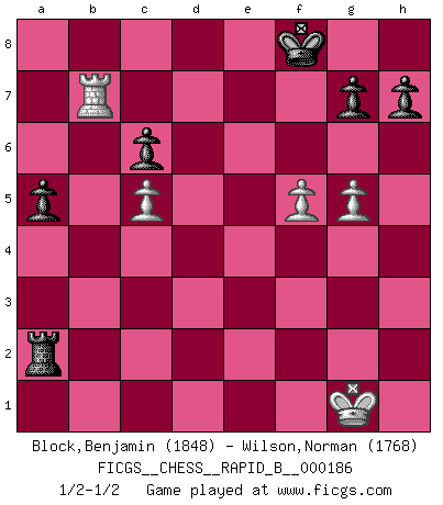 Last move : 1/2-1/2 2011 December 12 19:52:23 [Event "FICGS__CHESS__RAPID_B__000186"] [Site "FICGS"] [Date "2011.09.01"] [Round "1"] [White "Block,Benjamin"] [Black "Wilson,Norman"] [Result "1/2-1/2"] [WhiteElo "1848"] [BlackElo "1768"] 1.e4 c6 2.Nc3 d5 3.Nf3 Bg4 4.d4 e6 5.Bd3 Nf6 6.h3 Bh5 7.O-O dxe4 8.Nxe4 Nxe4 9.Bxe4 Nd7 10.Be3 Bd6 11.c4 O-O 12.Bc2 f5 13.c5 Bc7 14.Bb3 Qf6 15.g4 fxg4 16.Ng5 Ne5 17.Bxe6+ Kh8 18.hxg4 Nf7 19.Bxf7 Bxf7 20.Nxf7+ Rxf7 21.d5 Be5 22.g5 Qf5 23.f4 Bxb2 24.Rb1 Re8 25.Qf3 Qd3 26.Rfd1 Qa3 27.d6 Bc1 28.Rb3 Bxe3+ 29.Qxe3 Rxe3 30.Rxa3 Rxa3 31.d7 Rxd7 32.Rxd7 Kg8 33.Rxb7 Rxa2 34.f5 a5 35.Rb8+ Kf7 36.Rb7+ Kf8 37.Rb8+ Ke7 38.Rb7+ Kf8 39.Rb8+ Kf7 40.Rb7+ Kf8 1/2-1/2 Caro-Kann : Two knights, 3...Bg4 Kingside Castling by player White (move 7) Kingside Castling by player Black (move 11) This chess game ended in a draw. Follow this game move after move (download)The most powerful weapon in Chess is to have the next move. (David Bronstein) Ich organisiere ein großes Turnier, was mich etwa 120000 Dollar kostet. Ich denke, das ist das erste Mal in der Schachgeschichte, daß ein Schachgroßmeister auch als Mäzen auftritt. (Miguel Najdorf) Una victoria por una combinación errónea, aunque sea espectacular, me llena de horror artístico. (Wilhelm Steinitz) Les échecs sont un jeu terrible. Si vous n'avez pas le centre, votre adversaire a une position plus libre. Par contre, si vous avez le centre, alors vous avez vraiment quelque chose pour laquelle vous inquiéter ! (Siegbert Tarrasch) Drag your thoughts away from your troubles... by the ears, by the heels, or any other way you can manage it. (Mark Twain)