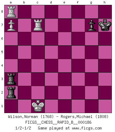 Last move : 1/2-1/2 2011 December 28 13:53:37 [Event "FICGS__CHESS__RAPID_B__000186"] [Site "FICGS"] [Date "2011.09.01"] [Round "1"] [White "Wilson,Norman"] [Black "Rogers,Michael"] [Result "1/2-1/2"] [WhiteElo "1768"] [BlackElo "1808"] 1.d4 f5 2.Nf3 e6 3.d5 exd5 4.Qxd5 d6 5.Ng5 Qe7 6.Nxh7 c6 7.Qb3 Rxh7 8.Qxg8 Rh4 9.Qb3 Na6 10.g3 Be6 11.Bg5 Qd7 12.Qc3 d5 13.Qd2 Rh8 14.Bg2 Nc5 15.h4 Bg8 16.c3 Ne6 17.Bf3 Bd6 18.Na3 Nxg5 19.Qxg5 Qf7 20.Nc2 Rh6 21.O-O-O Bh7 22.h5 f4 23.g4 Be7 24.Qe5 Re6 25.Qc7 Bg5 26.Qxf7+ Kxf7 27.b4 R6e8 28.Nd4 a6 29.a4 Kg8 30.Kb2 a5 31.b5 Rac8 32.Rd2 Kh8 33.Rg1 Bg8 34.Rc1 Bf6 35.Kc2 Bh4 36.Rf1 cxb5 37.Nxb5 Rc5 38.Kb2 Rd8 39.Rd4 Rf8 40.Rd3 Re8 41.e3 Rf8 42.exf4 Rxf4 43.Bd1 Be6 44.f3 Bxg4 45.Rd4 Rc4 46.Rxd5 Bh3 47.Rh1 Bg2 48.Rh2 Bxf3 49.Bxf3 Rxf3 50.Nd4 Rf4 51.Kb3 Rc8 52.Rb5 Bf2 53.Rxb7 Bxd4 54.cxd4 Rxd4 55.Rb5 Kh7 56.Rxa5 Rd3+ 57.Ka2 R8c3 58.Kb1 Rd4 59.Kb2 Rg3 60.Ra8 R3g4 61.a5 Rb4+ 62.Kc3 Rbc4+ 63.Kd3 Ra4 64.Rc2 Ra3+ 65.Kd2 Rg5 66.a6 Rxh5 67.Kc1 Rh6 68.a7 Rh1+ 69.Kb2 Rha1 70.Rc7 R1a2+ 71.Kb1 Ra1+ 72.Kc2 R1a2+ 73.Kc1 1/2-1/2 Dutch Queenside Castling by player White (move 21) 10 pieces endgame at move 54 : White KRRPP , Black KRRPP WHITE : King + 2 Rooks 2 Pawns BLACK : King + 2 Rooks 2 Pawns 9 pieces endgame at move 56 : White KRRPP , Black KRRP WHITE : King + 2 Rooks 2 Pawns BLACK : King + 2 Rooks 1 Pawn 8 pieces endgame at move 66 : White KRRP , Black KRRP WHITE : King + 2 Rooks 1 Pawn BLACK : King + 2 Rooks 1 Pawn This chess game ended in a draw. Follow this game move after move (download)What is the object of playing a gambit opening?... To acquire a reputation of being a dashing player at the cost of losing a game. (Siegbert Tarrasch) Es liegt in der Natur, vernüftig zu denken und unlogisch zu handeln. (Anatole France) Buenas posiciones no logran ganar juegos, buenas movidas sí. (Gerald Abrahams) Dieu déplace le joueur, et celui-ci la pièce. Quel Dieu derrière Dieu commence donc la trame ? Arturo Perez-Reverte (prix de littérature policière 1993). A person who never made a mistake never tried anything new. (Albert Einstein)
