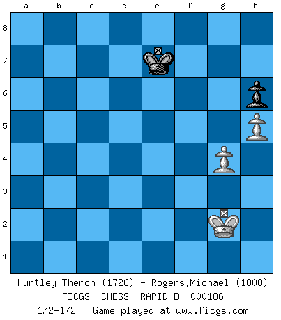 Last move : 1/2-1/2 2011 November 2 1:3:47 [Event "FICGS__CHESS__RAPID_B__000186"] [Site "FICGS"] [Date "2011.09.01"] [Round "1"] [White "Huntley,Theron"] [Black "Rogers,Michael"] [Result "1/2-1/2"] [WhiteElo "1726"] [BlackElo "1808"] 1.c4 e5 2.Nc3 Nf6 3.Nf3 Nc6 4.g3 Bb4 5.Bg2 O-O 6.O-O e4 7.Ng5 Bxc3 8.bxc3 Re8 9.f3 exf3 10.Nxf3 h6 11.Nh4 Ne5 12.Nf5 Rb8 13.d4 Nxc4 14.Bxh6 gxh6 15.Qc1 Ng4 16.Qf4 Kh7 17.Qxg4 Qg5 18.Qf3 b5 19.Qd3 Kh8 20.Rf4 Rb6 21.Raf1 d5 22.Bxd5 Bxf5 23.Rxf5 Qe3+ 24.R5f2 Nd6 25.Qxe3 Rxe3 26.Bxf7 b4 27.cxb4 Rxb4 28.d5 Rb2 29.Bh5 Re5 30.Bf3 Rxa2 31.Rc1 Re7 32.e4 Ra3 33.e5 Rxe5 34.Rxc7 Rf5 35.Bg4 Rxf2 36.Kxf2 Ne4+ 37.Kg2 Ra5 38.Be6 Ng5 39.g4 Nxe6 40.dxe6 Re5 41.e7 Kg8 42.Rxa7 Kf7 43.Kf3 Re1 44.Kf4 Kf6 45.h4 Rf1+ 46.Kg3 Re1 47.Kf2 Re4 48.Kf3 Re1 49.Rd7 Kf7 50.Rc7 Rh1 51.h5 Rf1+ 52.Ke3 Re1+ 53.Kf4 Rf1+ 54.Kg3 Rf6 55.Ra7 Rb6 56.Rd7 Rb3+ 57.Kh4 Rb6 58.Ra7 Re6 59.Kh3 Rxe7 60.Rxe7+ Kxe7 61.Kg2 1/2-1/2 English Opening Kingside Castling by player Black (move 5) Kingside Castling by player White (move 6) 10 pieces endgame at move 39 : White KRPPP , Black KRNPP WHITE : King + 1 Rook 3 Pawns BLACK : King + 1 Rook 1 Knight 2 Pawns 9 pieces endgame at move 40 : White KRPPP , Black KRPP WHITE : King + 1 Rook 3 Pawns BLACK : King + 1 Rook 2 Pawns 8 pieces endgame at move 42 : White KRPPP , Black KRP WHITE : King + 1 Rook 3 Pawns BLACK : King + 1 Rook 1 Pawn 7 pieces endgame at move 59 : White KRPP , Black KRP WHITE : King + 1 Rook 2 Pawns BLACK : King + 1 Rook 1 Pawn 6 pieces endgame at move 60 : White KRPP , Black KP WHITE : King + 1 Rook 2 Pawns BLACK : King + 1 Pawn 5 pieces endgame at move 60 : White KPP , Black KP WHITE : King + 2 Pawns BLACK : King + 1 Pawn This chess game ended in a draw. Follow this game move after move (download)It began to feel as though you were playing against Chess itself. - On playing against Robert Fischer. (Walter Shipman) Wie, soll nun auch die Opposition abgeschafft werden? Ja, es tut mir leid, Ihnen diesen Schmerz nicht ersparen zu können. (Aaron Nimzowitsch) Cuando me preguntan: -¿Cual es el secreto que te hace hacer mejores movidas que tus oponentes?, Yo respondo: Me da gusto que me pregunten eso, porque, como veran, hay una simple razón. Yo pienso mis propias movidas y dejo a mi oponente que el piense las suyas. (Alexander Alekhine) Le système Elo représente seulement une moyenne. Il est simplement un indicateur de votre stabilité. (Anatoli Karpov) If you know the enemy and know yourself you need not fear the results of a hundred battles. (Sun Tzu)