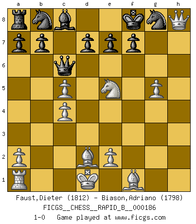 Last move : 1-0 2011 October 30 12:5:5 [Event "FICGS__CHESS__RAPID_B__000186"] [Site "FICGS"] [Date "2011.09.01"] [Round "1"] [White "Faust,Dieter"] [Black "Biason,Adriano"] [Result "1-0"] [WhiteElo "1812"] [BlackElo "1798"] 1.d4 h6 2.c4 g5 3.Nc3 Bg7 4.f4 c5 5.dxc5 Bxc3+ 6.bxc3 Qa5 7.fxg5 hxg5 8.Bxg5 Qxc3+ 9.Bd2 Qg7 10.Qc1 Rxh2 11.Rxh2 Qg3+ 12.Kd1 Qxh2 13.Nf3 Qc7 14.Qb2 Nf6 15.g4 Qc6 16.g5 Ng8 17.Qh8 Kf8 18.Ne5 1-0 This chess game has been lost on time (started : 2011.09.01 16:45:39) Queen's pawn Player White won this chess game. Follow this game move after move (download)In Chess, at least, the brave inherit the earth. (Edmar Mednis) Woher wissen wir, daß der Neanderthaler Blindschach gespielt hat? -- Bei Ausgrabungen wurden keine Schachbretter und Figuren gefunden. (Anonymous) Nunca nadie ha ganado una partida de Ajedrez rindiendose. (Unknown) Les sacrifices démontrent seulement que quelqu'un a gaffé. (Savielly Tartacover) You can't play chess if you're groggy from pills. (Anatoly Karpov)
