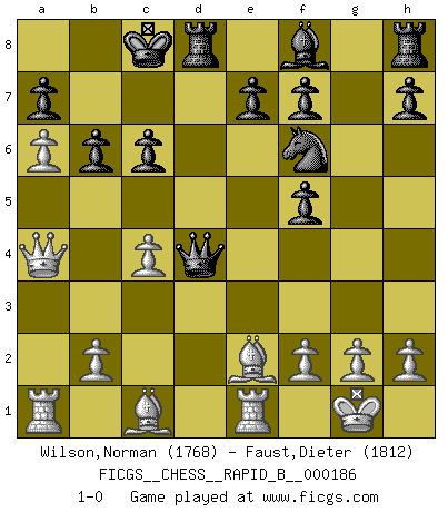 Last move : 1-0 2011 September 16 15:57:47 [Event "FICGS__CHESS__RAPID_B__000186"] [Site "FICGS"] [Date "2011.09.01"] [Round "1"] [White "Wilson,Norman"] [Black "Faust,Dieter"] [Result "1-0"] [WhiteElo "1768"] [BlackElo "1812"] 1.e4 d5 2.exd5 Qxd5 3.Nc3 Qd6 4.d4 Nf6 5.Be2 c6 6.Nf3 Bf5 7.O-O Nbd7 8.Nh4 g6 9.Re1 Nb6 10.Nxf5 gxf5 11.a4 O-O-O 12.a5 Nbd5 13.Nxd5 Qxd5 14.a6 b6 15.c4 Qxd4 16.Qa4 1-0 Scandinavian : Pytel-Wade variation Kingside Castling by player White (move 7) Queenside Castling by player Black (move 11) Player White won this chess game. Follow this game move after move (download)By playing at Chess then, we may learn: First: Foresight... Second: Circumspection... Third: Caution... And lastly, we learn by Chess the habit of not being discouraged by present bad appearances in the state of our affairs, the habit of hoping for a favorable chance, and that of persevering in the secrets of resources. (Benjamin Franklin) Kombinieren und Schwarzhandel gehören verboten. (Savielly Grigorievitsch Tartakower) ¡Examina movidas que hagan daño! Un buen ojo for movidas desvastantes es mucho mas importante que el conocimiento de principios estratégicos. (Purdy) Karpov est une pièce de musée. (Garry Kasparov) If you work for a living, why do you kill yourself working ? (Tuco to a chicken in The Good, The Bad and The Ugly)