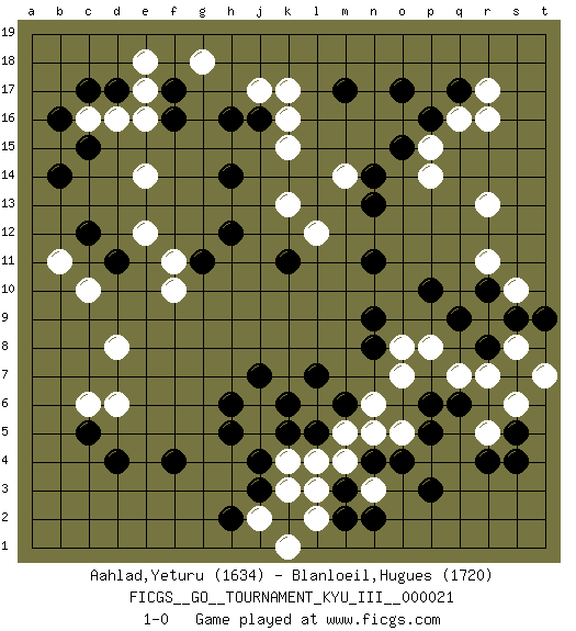 Last move : 1-0 2012 March 22 9:28:15 [Event "FICGS__GO__TOURNAMENT_KYU_III__000021"] [Site "FICGS"] [Date "2011.09.02"] [Round "1"] [Black "Aahlad,Yeturu"] [White "Blanloeil,Hugues"] [Result "1-0"] [Rating 1 "1634"] [Rating 2 "1720"] 1.d4 q16 2.r4 d16 3.p3 c6 4.f4 d8 5.c5 d6 6.r10 r13 7.j3 k17 8.q17 r16 9.o17 r17 10.p16 p15 11.o15 p14 12.j16 k16 13.f17 e17 14.f16 j17 15.h16 k15 16.h14 k13 17.c17 c16 18.d17 e18 19.b16 e16 20.c15 e14 21.h12 e12 22.c12 c10 23.d11 f11 24.g11 f10 25.k11 m4 26.m17 m14 27.n13 l12 28.n11 g18 29.m6 o5 30.n4 r7 31.p10 o8 32.n9 s6 33.s5 s8 34.s9 t7 35.q6 q7 36.p6 r9 37.q9 p8 38.n8 s10 39.t9 r11 40.r8 k4 41.k6 j5 42.h6 l2 43.n2 n3 44.m3 n5 45.o4 m5 46.h5 j6 47.j7 l6 48.l7 l3 49.m2 j2 50.h2 k1 51.j4 k3 52.k5 n6 53.l5 o7 54.p5 l4 55.n14 b11 56.b14 r5 57.s4 1-0 This go game has been lost on time (started : 2011.09.02 13:37:50) Here are the names of the openings (joseki) played in the four corners : Corner d4 : d4 c6 Hoshi (Hwajeom, Seongjeom, Xingwei`) 4-4 Point. The star or hoshi (4-4) point, emphasizing influence at the potential expense of territory. Ikken Kakari (Hankan Keolch'im, Yi Gua`jiao~, 1-Space Low Approach). White 2 is the standard approach move to the 4-4. Corner d16 : d16 j16 Hoshi (Hwajeom, Seongjeom, Xingwei`) 4-4 Point. The star or hoshi (4-4) point, emphasizing influence at the potential expense of territory. Player Black won this Go (weiqi, baduk) game. Follow this game move after move (download)Don't make a play adjacent to a cutting-point. (Anonymous) If we knew what we were doing, we would not call it research. (Albert Einstein)