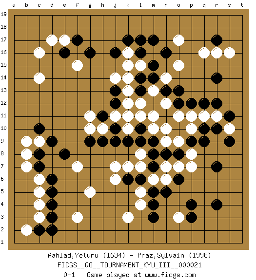 Last move : 0-1 2012 March 28 21:11:10 [Event "FICGS__GO__TOURNAMENT_KYU_III__000021 "] [Site "FICGS"] [Date "2011.09.02"] [Round "1"] [Black "Aahlad,Yeturu "] [White "Praz,Sylvain "] [Result "0-1"] [Rating 1 "1634"] [Rating 2 "1998"] 1.d4 q16 2.r4 c16 3.e16 e17 4.f17 d17 5.r14 o17 6.g16 c14 7.l17 s16 8.q10 o3 9.p4 k3 10.p3 f3 11.c7 c3 12.d3 c4 13.d5 c5 14.c2 c6 15.d6 b2 16.d2 b7 17.c8 b8 18.c10 c9 19.d9 b9 20.e8 g5 21.m3 l5 22.m5 m6 23.m7 n6 24.l6 l4 25.m4 o7 26.n8 l7 27.k6 l8 28.o8 j7 29.o6 n7 30.m8 p7 31.n5 j6 32.r7 p8 33.p9 o9 34.o10 n9 35.m9 n10 36.n11 m10 37.l9 m11 38.k9 k7 39.o12 k11 40.h9 f7 41.m12 k10 42.j10 j11 43.h11 l12 44.l13 k13 45.l10 l11 46.j12 k12 47.j13 k14 48.l14 l15 49.m15 m13 50.m14 n12 51.n13 o11 52.o13 p10 53.q9 q11 54.p12 p11 55.q12 r11 56.r10 j14 57.j16 k16 58.k17 s10 59.s9 o15 60.s11 n14 61.m12 g10 62.g9 m13 63.r12 m16 64.m12 h10 65.j9 m13 66.r17 r16 67.m12 g11 68.l16 k15 69.n16 m13 70.m17 f15 0-1 Here are the names of the openings (joseki) played in the four corners : Corner d16 : c16 e16Komoku (Somok, Xiao~mu`) 3-4 Point. The komoku (3-4) point is the traditional corner enclosure move..Ikken Takagakari (Hankan Nop'dakeolch'im, Yi Gaogua`jiao~, 1-Space High Approach). The 5-4 approach move has become more popular in modern times, as modern Go emphasizes speed and influence. Corner q16 : q16 r14Hoshi (Hwajeom, Seongjeom, Xingwei`) 4-4 Point. The star or hoshi (4-4) point, emphasizing influence at the potential expense of territory.Ikken Kakari (Hankan Keolch'im, Yi Gua`jiao~, 1-Space Low Approach). Black 2 is the standard approach move to the 4-4. Corner q4 : r4 o3Komoku (Somok, Xiao~mu`) 3-4 Point. The komoku (3-4) point is the traditional corner enclosure move..Niken Kakari (Dukan Keolch'im, E`r Gua`jiao~, 2-Space Low Approach). White 2 is used with friendly forces backing it up. Its purpose is to prevent a pincer. Locally it results in a loss, but may be appropriate fuseki strategy. It was popular in the late 1950s and early 1960s, but is not seen often nowadays, having been replaced by the one-space high approach, with which it has points in common. Corner d4 : d4 f3Hoshi (Hwajeom, Seongjeom, Xingwei`) 4-4 Point. The star or hoshi (4-4) point, emphasizing influence at the potential expense of territory.Ikken Kakari (Hankan Keolch'im, Yi Gua`jiao~, 1-Space Low Approach). White 2 is the standard approach move to the 4-4. Player White won this Go (weiqi, baduk) game.Follow this game move after move (download ) The rectangular six is normally alive. (Anonymous) The smarter you play, the luckier you'll be. (Mark Pilarski)
