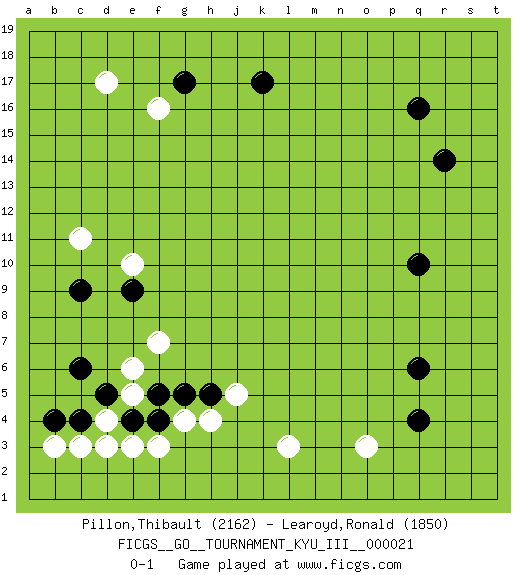 Last move : 0-1 2011 November 30 14:36:6 [Event "FICGS__GO__TOURNAMENT_KYU_III__000021"] [Site "FICGS"] [Date "2011.09.02"] [Round "1"] [Black "Pillon,Thibault"] [White "Learoyd,Ronald"] [Result "0-1"] [Rating 1 "2162"] [Rating 2 "1850"] 1.q16 d4 2.q4 d17 3.q10 c11 4.g17 f16 5.k17 l3 6.c6 f3 7.b4 c3 8.c9 e10 9.d5 b3 10.e4 e3 11.c4 d3 12.r14 o3 13.q6 e5 14.f4 g4 15.f5 e6 16.g5 h4 17.e9 f7 18.h5 j5 0-1 This go game has been lost on time (started : 2011.09.02 13:37:50) Here are the names of the openings (joseki) played in the four corners : Corner q4 : q4 l3 Hoshi (Hwajeom, Seongjeom, Xingwei`) 4-4 Point. The star or hoshi (4-4) point, emphasizing influence at the potential expense of territory. Corner d4 : d4 c6 Hoshi (Hwajeom, Seongjeom, Xingwei`) 4-4 Point. The star or hoshi (4-4) point, emphasizing influence at the potential expense of territory. Ikken Kakari (Hankan Keolch'im, Yi Gua`jiao~, 1-Space Low Approach). Black 2 is the standard approach move to the 4-4. Player White won this Go (weiqi, baduk) game. Follow this game move after move (download)Don't overlook the edge of the board. (Anonymous) Every vice is only an exaggeration of a necessary and virtuous function. (Ralph Waldo Emerson, Journals 1936)
