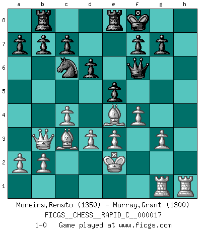 Last move : 1-0 2007 March 14 1:44:15 [Event "FICGS__CHESS__RAPID_C__000017"] [Site "FICGS"] [Date "2007.01.02"] [Round "1"] [White "Moreira,Renato"] [Black "Murray,Grant"] [Result "1-0"] [WhiteElo "1350"] [BlackElo "1300"] 1.c4 e5 2.Nc3 Nf6 3.g3 Bb4 4.Qb3 Nc6 5.Bg2 O-O 6.d3 d6 7.Bd2 Bd7 8.e3 Ng4 9.h3 Bxc3 10.Bxc3 Qf6 11.hxg4 Rab8 12.Ne2 Bxg4 13.f4 Bxe2 14.Kxe2 Qg6 15.Rag1 Rfe8 16.Be4 Qf6 17.Bxh7+ Kf8 18.Be4 1-0 This chess game has been lost on time (started : 2007.01.02 16:39:44) English : Bremen, Smyslov system Kingside Castling by player Black (move 5) Player White won this chess game. Follow this game move after move (download)As one by one I mowed them down, my superiority soon became apparent. (Jose Capablanca) Frage des Reporters: -Worin besteht das Ziel von Gambiteröffnungen? Antwort: -Auf Kosten der Partie einen Ruf als Angriffspieler zu erwerben.- (Siegbert Tarrasch) Después de la respuesta de las negras a 1.e4 con 1..e5, se quedan siempre tratando de entrar dentro del juego. (Howard Staunton) Votre prénom est 'Tactique', votre deuxième prénom est 'Tactique' et votre nom est 'Tactique'. (Ken Smith) We're missing something. (Gregory House, House M.D.)
