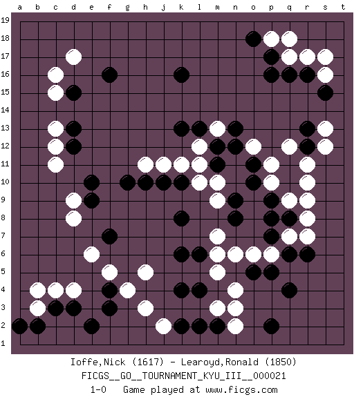 Last move : 1-0 2012 February 9 7:17:18 [Event "FICGS__GO__TOURNAMENT_KYU_III__000021"] [Site "FICGS"] [Date "2011.09.02"] [Round "1"] [Black "Ioffe,Nick"] [White "Learoyd,Ronald"] [Result "1-0"] [Rating 1 "1617"] [Rating 2 "1850"] 1.q16 d4 2.q4 d17 3.q10 c11 4.k16 n3 5.k4 h3 6.d15 c16 7.f16 c15 8.d13 c13 9.d12 c12 10.e10 d9 11.e9 d8 12.f7 e6 13.c3 c4 14.d3 b3 15.b2 b4 16.f3 g4 17.f4 f5 18.e2 h5 19.a2 m5 20.q6 r17 21.r16 q17 22.p17 s16 23.s15 s17 24.p16 p18 25.o18 q18 26.k6 m7 27.k8 m9 28.m11 l10 29.k10 l11 30.m12 k11 31.j10 j11 32.g10 r8 33.q8 r7 34.r6 q7 35.p7 q9 36.p8 r10 37.q11 r11 38.p9 r9 39.r12 s12 40.r13 s13 41.l2 j2 42.l4 n4 43.p2 n2 44.m2 m3 45.k2 p6 46.p5 o6 47.o5 n6 48.l6 m6 49.k13 h11 50.h10 l12 51.l13 p10 52.o10 p11 53.n9 m10 54.o11 q12 55.n8 o12 56.n12 m13 57.n13 1-0 This go game has been lost on time (started : 2011.09.02 13:37:50) Here are the names of the openings (joseki) played in the four corners : Corner q4 : q4 n3 Hoshi (Hwajeom, Seongjeom, Xingwei`) 4-4 Point. The star or hoshi (4-4) point, emphasizing influence at the potential expense of territory. Niken Kakari (Dukan Keolch'im, E`r Gua`jiao~, 2-Space Low Approach). Black typically answers by 7-3 or 3-5 (which is not joseki). Corner q16 : q16 r17 Hoshi (Hwajeom, Seongjeom, Xingwei`) 4-4 Point. The star or hoshi (4-4) point, emphasizing influence at the potential expense of territory. Player Black won this Go (weiqi, baduk) game. Follow this game move after move (download)Never try to cut bamboo joints. (Anonymous) When I took office, only high energy physicists had ever heard of what is called the World Wide Web... Now even my cat has its own page. (Bill Clinton, 1996)