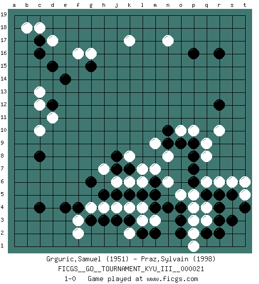 Last move : 1-0 2011 October 20 18:29:56 [Event "FICGS__GO__TOURNAMENT_KYU_III__000021"] [Site "FICGS"] [Date "2011.09.02"] [Round "1"] [Black "Grguric,Samuel"] [White "Praz,Sylvain"] [Result "1-0"] [Rating 1 "1951"] [Rating 2 "1998"] 1.p16 d17 2.c4 q4 3.e4 c10 4.r16 r10 5.o3 q6 6.d15 f16 7.c8 c13 8.e14 k17 9.c17 c18 10.c16 b18 11.d12 c12 12.g15 g16 13.j3 d11 14.r12 n17 15.r3 q3 16.q2 p2 17.r2 p3 18.s5 s6 19.o2 p1 20.r5 r6 21.q5 p5 22.o4 t5 23.r4 p4 24.p6 o5 25.t4 t6 26.p7 q8 27.s3 m3 28.n4 n6 29.p8 q9 30.m4 n8 31.p9 p10 32.n9 o10 33.o9 m9 34.n10 l4 35.l5 k4 36.k5 j4 37.m6 m7 38.h3 h4 39.g3 h7 40.k7 k8 41.j8 l7 42.j7 l6 43.m5 k6 44.j5 j6 45.h5 g4 46.g6 f3 47.f4 f2 48.l2 l3 49.m2 k2 50.k3 1-0 Here are the names of the openings (joseki) played in the four corners : Corner q4 : q4 o3 Hoshi (Hwajeom, Seongjeom, Xingwei`) 4-4 Point. The star or hoshi (4-4) point, emphasizing influence at the potential expense of territory. Ikken Kakari (Hankan Keolch'im, Yi Gua`jiao~, 1-Space Low Approach). Black 2 is the standard approach move to the 4-4. Corner d16 : d17 d15 Komoku (Somok, Xiao~mu`) 3-4 Point. The komoku (3-4) point is the traditional corner enclosure move.. Ikken Takagakari (Hankan Nop'dakeolch'im, Yi Gaogua`jiao~, 1-Space High Approach). The 5-4 approach move has become more popular in modern times, as modern Go emphasizes speed and influence. Player Black won this Go (weiqi, baduk) game. Follow this game move after move (download)Strike at the waist of the knight's move. (Anonymous) Luck is what you have left over after you give 100 percent. (Langston Coleman)