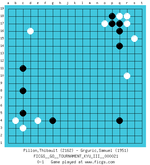 Last move : 0-1 2011 November 20 12:49:36 [Event "FICGS__GO__TOURNAMENT_KYU_III__000021 "] [Site "FICGS"] [Date "2011.09.02"] [Round "1"] [Black "Pillon,Thibault "] [White "Grguric,Samuel "] [Result "0-1"] [Rating 1 "2162"] [Rating 2 "1951"] 1.q16 d16 2.q4 e4 3.c5 c3 4.c8 o17 5.q14 r10 6.g4 b4 7.c11 r17 8.q17 q18 9.p18 r18 10.p17 s15 0-1 Here are the names of the openings (joseki) played in the four corners : Corner d4 : e4 c5Takamoku (Gomok, Gaomu`) 5-4 Point. The takamoku (high) point (5-4). With its emphasis on influence, the 5-4 point complements the 4-4 (hoshi) point in creating an influence-oriented fuseki. Corner q16 : q16 o17Hoshi (Hwajeom, Seongjeom, Xingwei`) 4-4 Point. The star or hoshi (4-4) point, emphasizing influence at the potential expense of territory.Ikken Kakari (Hankan Keolch'im, Yi Gua`jiao~, 1-Space Low Approach). White 2 is the standard approach move to the 4-4. Corner d16 : d16 c11Hoshi (Hwajeom, Seongjeom, Xingwei`) 4-4 Point. The star or hoshi (4-4) point, emphasizing influence at the potential expense of territory. Player White won this Go (weiqi, baduk) game.Follow this game move after move (download ) Go is to western chess what philosophy is to double entry accounting. (from Shibumi, by Trevanian) An expert is a man who has made all the mistakes which can be made in a very narrow field. (Niels Bohr)