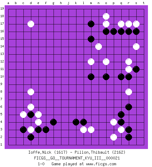 Last move : 1-0 2011 November 30 14:36:7 [Event "FICGS__GO__TOURNAMENT_KYU_III__000021"] [Site "FICGS"] [Date "2011.09.02"] [Round "1"] [Black "Ioffe,Nick"] [White "Pillon,Thibault"] [Result "1-0"] [Rating 1 "1617"] [Rating 2 "2162"] 1.q16 d17 2.q4 d3 3.q10 o17 4.m17 r17 5.r16 q17 6.p16 s17 7.o16 o18 8.k4 r8 9.r6 r11 10.r10 s14 11.s11 r12 12.s16 o12 13.o10 n14 14.m15 m12 15.m10 p2 16.r2 p4 17.q5 q3 18.r3 l3 19.l4 m3 20.d5 d8 21.f3 e4 22.g4 e5 23.c3 d6 24.d2 c5 25.e3 1-0 This go game has been lost on time (started : 2011.09.02 13:37:50) Here are the names of the openings (joseki) played in the four corners : Corner q16 : q16 o17 Hoshi (Hwajeom, Seongjeom, Xingwei`) 4-4 Point. The star or hoshi (4-4) point, emphasizing influence at the potential expense of territory. Ikken Kakari (Hankan Keolch'im, Yi Gua`jiao~, 1-Space Low Approach). White 2 is the standard approach move to the 4-4. Corner q4 : q4 r8 Hoshi (Hwajeom, Seongjeom, Xingwei`) 4-4 Point. The star or hoshi (4-4) point, emphasizing influence at the potential expense of territory. Corner d4 : d3 d5 Komoku (Somok, Xiao~mu`) 3-4 Point. The komoku (3-4) point is the traditional corner enclosure move.. Ikken Takagakari (Hankan Nop'dakeolch'im, Yi Gaogua`jiao~, 1-Space High Approach). The 5-4 approach move has become more popular in modern times, as modern Go emphasizes speed and influence. Player Black won this Go (weiqi, baduk) game. Follow this game move after move (download)Only amateurs try to come up with fancy moves. (Anonymous) Happy endings are just stories that haven't finished yet. (Jane Smith in Mr & Mrs Smith)