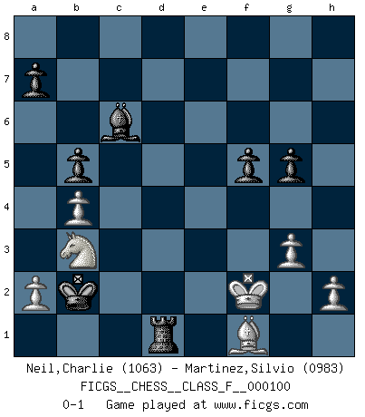 Last move : 0-1 2011 November 27 11:8:36 [Event "FICGS__CHESS__CLASS_F__000100"] [Site "FICGS"] [Date "2011.09.02"] [Round "1"] [White "Neil,Charlie"] [Black "Martinez,Silvio"] [Result "0-1"] [WhiteElo "1063"] [BlackElo "0983"] 1.e4 e5 2.Nf3 Nc6 3.d4 exd4 4.Nxd4 Nf6 5.Nxc6 dxc6 6.Bg5 Be7 7.Nc3 Qxd1+ 8.Rxd1 O-O 9.e5 Nd5 10.Bxe7 Nxe7 11.Bc4 b5 12.Bd3 Ba6 13.b4 Rfe8 14.O-O Ng6 15.Rfe1 Nxe5 16.Be4 h6 17.g3 Rad8 18.Rxd8 Rxd8 19.Ne2 g6 20.Nf4 f5 21.Bg2 g5 22.Rxe5 Bc8 23.Nd3 Bb7 24.Re6 Kg7 25.Nc5 Ba8 26.Rxc6 Rd1+ 27.Bf1 Bxc6 28.Ne6+ Kg6 29.Nxc7 Kf6 30.Na6 Ke5 31.Nc5 Kd4 32.Nb3+ Kc3 33.f4 Kxc2 34.fxg5 hxg5 35.Kf2 Kb2 0-1 Scotch : Schmidt variation Kingside Castling by player Black (move 8) Kingside Castling by player White (move 14) Player Black won this chess game. Follow this game move after move (download)Fischer is an American Chess tragedy on par with Morphy and Pillsbury. (Mig Greengard) Ein unbeabsichtigtes Patt ist der Gipfel der Dummheit. (Anonymous) La señal de un Gran Maestro es su habilidad de ganar una partida rápidamente y sin dolor. (Irving Chernev) RxDa4 pat (...) Good decisions come from experience, and experience comes from bad decisions. (Anonymous)