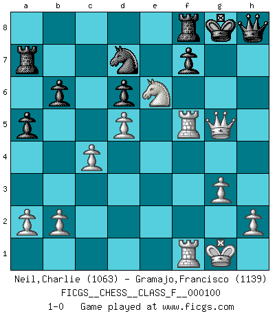 Last move : 1-0 2011 October 3 4:23:1 [Event "FICGS__CHESS__CLASS_F__000100"] [Site "FICGS"] [Date "2011.09.02"] [Round "1"] [White "Neil,Charlie"] [Black "Gramajo,Francisco"] [Result "1-0"] [WhiteElo "1063"] [BlackElo "1139"] 1.d4 Nf6 2.Bg5 h6 3.Bxf6 exf6 4.g3 Bd6 5.Bg2 O-O 6.c4 c5 7.d5 b6 8.Nc3 Be5 9.Rc1 d6 10.Qc2 a6 11.e4 Bg4 12.Nge2 Qd7 13.O-O Bh3 14.f4 Bxg2 15.Kxg2 Bd4 16.Nxd4 cxd4 17.Ne2 a5 18.Nxd4 g5 19.fxg5 hxg5 20.Rxf6 Qe7 21.Rcf1 Ra7 22.Qd2 Qxe4+ 23.Kg1 Qe5 24.Ne6 Nd7 25.R6f5 Qh8 26.Qxg5+ 1-0 Trompowsky attack (Ruth, Opovcensky Opening) Kingside Castling by player Black (move 5) Kingside Castling by player White (move 13) Player White won this chess game. Follow this game move after move (download)Nothing excites jaded Grandmasters more than a theoretical novelty. (Dominic Lawson) Wer wird heute Abend ihr Gegner sein? -- Heute Abend spiele ich gegen die schwarzen Steine. (Akiba Rubinstein) El jugador táctico sabe que hacer cuando hay algo que hacer; mientras que el estratega sabe que hacer cuando no hay nada que hacer. (Gerald Abrahams) Les réformistes prétendent que les progrès de la théorie conduiront à la disparition des échecs, et qu'il faut, pour leur rendre vie, en remanier les règles. En réalité, qu'exprime cette affirmation? Le mépris de l'intuition, de l'imagination et de tous les autres éléments qui font des échecs un art. (Alexander Alekhine) Knowledge rests not upon truth alone, but upon error also. (Carl G. Jung)