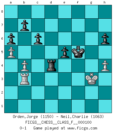 Last move : 0-1 2011 November 2 9:30:18 [Event "FICGS__CHESS__CLASS_F__000100"] [Site "FICGS"] [Date "2011.09.02"] [Round "1"] [White "Orden,Jorge"] [Black "Neil,Charlie"] [Result "0-1"] [WhiteElo "1150"] [BlackElo "1063"] 1.e4 e5 2.Nf3 Nc6 3.Nc3 Nf6 4.Be2 Bb4 5.d3 O-O 6.O-O d6 7.Bd2 Be6 8.Ng5 Nd4 9.Nxe6 Nxe6 10.f4 Nd4 11.f5 Bxc3 12.Bxc3 Nc6 13.a3 d5 14.b4 dxe4 15.dxe4 Nxe4 16.Qxd8 Raxd8 17.Bb2 Nd4 18.Bf3 Nxf3+ 19.Rxf3 f6 20.c4 c6 21.R3f1 Rd2 22.Rab1 Nd6 23.g4 Nxc4 24.Rf2 Rxf2 25.Kxf2 Nxb2 26.Rxb2 Rd8 27.a4 Rd4 28.Kf3 h6 29.h4 Kf7 30.a5 a6 31.Rb3 g6 32.fxg6+ Kxg6 33.Kg3 f5 34.gxf5+ Kxf5 0-1 Four knights game Kingside Castling by player Black (move 5) Kingside Castling by player White (move 6) Player Black won this chess game. Follow this game move after move (download)Via the squares on the chessboard, the Indians explain the movement of time and the age, the higher influences which control the world and the ties which link Chess with the human soul. (Al-Masudi) Ein Teil des Fehlers ist immer korrekt. (Savielly Grigorievitsch Tartakower) Yo no creo en la psicología. Yo creo en las buenas movidas. (Bobby Fischer) Le profane ne songe pas à la somme de jouissance dont il se prive, qui méconnaît ce jeu aux ressources aussi variées que passionnantes. (Jean-Marie Jeanton-Lamarche) If you don't practice you don't deserve to win. (Andre Agassi)