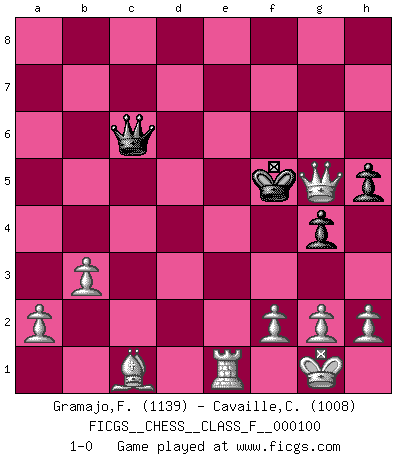 Last move : 1-0 2011 October 11 17:53:40 [Event "FICGS__CHESS__CLASS_F__000100"] [Site "FICGS"] [Date "2011.09.02"] [Round "1"] [White "Gramajo,Francisco"] [Black "Cavaille,Cedric"] [Result "1-0"] [WhiteElo "1139"] [BlackElo "1008"] 1.e4 c5 2.Nf3 d6 3.Bc4 Nf6 4.Ng5 d5 5.exd5 Nxd5 6.Nxf7 Kxf7 7.Qf3+ Ke8 8.Bxd5 e6 9.Bxb7 Bxb7 10.Qxb7 Qd5 11.Qb5+ Qc6 12.Qe2 Be7 13.O-O h5 14.Nc3 g5 15.Ne4 Nd7 16.d3 g4 17.Bf4 Nf6 18.Nxf6+ Bxf6 19.c3 e5 20.d4 cxd4 21.cxd4 Kf7 22.dxe5 Be7 23.Rac1 Qd5 24.b3 Rac8 25.Rxc8 Rxc8 26.Qa6 Rc3 27.Qxa7 Ke6 28.Qb6+ Qc6 29.Qd4 Rc1 30.Bxc1 Bd8 31.Qxd8 Kxe5 32.Re1+ Kf5 33.Qg5+ 1-0 Sicilian Kingside Castling by player White (move 13) Player White won this chess game. Follow this game move after move (download)Best by test: 1. e4 (Bobby Fischer) Schach ist wie eine schöne Frau, zu der wir ständig zurückkehren, gleichviel, wie oft sie uns zurückweist. (Anonymous) El arma más poderosa en el Ajedrez, es tener la próxima movida. (David Bronstein) Vouloir jouer aux échecs contre soi-même est aussi paradoxal que vouloir marcher sur son ombre. (Stefan Zweig) May I never be complete. May I never be content. May I never be perfect. Deliver me, Tyler, from being perfect and complete. (Chuck Palahniuk, Fight Club)