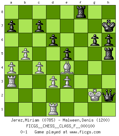 Last move : 0-1 2011 December 1 18:1:0 [Event "FICGS__CHESS__CLASS_F__000100"] [Site "FICGS"] [Date "2011.09.02"] [Round "1"] [White "Jerez,Miriam"] [Black "Malween,Denis"] [Result "0-1"] [WhiteElo "0785"] [BlackElo "1200"] 1.e4 e5 2.Nf3 Nc6 3.Bc4 Bc5 4.Nc3 Nf6 5.O-O d6 6.Ng5 O-O 7.a3 h6 8.Nf3 Bg4 9.h3 Bh5 10.b4 Bb6 11.g4 Nxg4 12.hxg4 Bxg4 13.d3 Nd4 14.Nxd4 Bxd1 15.Rxd1 Bxd4 16.Ra2 Bxc3 17.b5 Kh7 18.a4 f5 19.Ra3 Ba5 20.exf5 Rxf5 21.Bd5 Rh5 22.Bxb7 Rb8 23.Be4+ g6 24.c4 Qh4 25.Kf1 Rf8 26.Be3 Bb6 27.Kg2 Bxe3 28.fxe3 Qh2+ 0-1 Giuoco Piano : Four knights variation Kingside Castling by player White (move 5) Kingside Castling by player Black (move 6) Player Black won this chess game. Follow this game move after move (download)The laws of Chess do not permit a free choice: you have to move whether you like it or not. (Emanuel Lasker) Karpov ist ein Museumsstück. (Garry Kasparov) El ganador de una partida es aquel jugador que hace el penúltimo error. (Savielly Tartakover) Les sacrifices démontrent seulement que quelqu'un a gaffé. (Savielly Tartacover) How many people work in NATO Headquarters ? - About half of them. (Dirk Stikker, NATO general secretary)