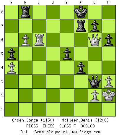 Last move : 0-1 2011 December 16 17:0:52 [Event "FICGS__CHESS__CLASS_F__000100"] [Site "FICGS"] [Date "2011.09.02"] [Round "1"] [White "Orden,Jorge"] [Black "Malween,Denis"] [Result "0-1"] [WhiteElo "1150"] [BlackElo "1200"] 1.e4 c5 2.Nf3 d6 3.d4 cxd4 4.Nxd4 Nf6 5.Nc3 a6 6.Be2 e5 7.Nf3 Be7 8.O-O Nc6 9.Be3 O-O 10.h3 h6 11.a3 Be6 12.b4 Rc8 13.Nd5 Bxd5 14.exd5 Nb8 15.c4 Nbd7 16.a4 Nh7 17.b5 a5 18.Rc1 f5 19.Qd2 f4 20.Ba7 b6 21.Nh2 Qc7 22.Bxb6 Nxb6 23.Rc2 Nd7 24.Qd3 Nc5 25.Bg4 Ra8 26.Be6+ Nxe6 27.dxe6 Qc8 28.Qd5 Nf6 29.Qd2 Qxe6 30.Re1 Qc8 31.Qe2 Qc5 32.Ng4 Nxg4 33.Qxg4 Rf7 34.Rd1 Raf8 35.Rb1 Bd8 36.Rd1 Bb6 37.Qe6 Rd8 38.Rd5 Qb4 39.Kh2 Kf8 40.Rcd2 Qxc4 41.Qg6 Bxf2 42.b6 Qf1 43.Rxf2 Qxf2 44.Rxd6 Rb8 45.Rc6 Qg3+ 0-1 Sicilian : Najdorf, Opovcensky variation Kingside Castling by player White (move 8) Kingside Castling by player Black (move 9) Player Black won this chess game. Follow this game move after move (download)Chess opens and enriches your mind. (Saudin Robovic) Fischer: 'Remis!?' Uhlmann: 'Aber es muss doch dreimal Zugwiederholung sein!' Fischer: 'Sie nehmen das Remis an, wie ich es sage, sonst spiele ich weiter und werde Sie dann schlagen!' (Robert James Fischer) Después de una mala apertura, hay una esperanza en el juego medio. Pero una vez que estas en finales, el momento de la verdad ha llegado. (Edmar Mednis) Mais l'homme est une créature légère et illogique : semblable au joueur d'échecs, il n'aime que le processus du but à atteindre, non le but lui-même. (Dostoïevsky) Big Chess is a place for big hallucinations. (Thibault de Vassal)