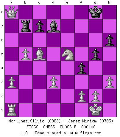Last move : 1-0 2011 October 19 1:45:10 [Event "FICGS__CHESS__CLASS_F__000100"] [Site "FICGS"] [Date "2011.09.02"] [Round "1"] [White "Martinez,Silvio"] [Black "Jerez,Miriam"] [Result "1-0"] [WhiteElo "0983"] [BlackElo "0785"] 1.e4 e5 2.Nf3 Nc6 3.Bc4 Nf6 4.Nc3 Bc5 5.O-O O-O 6.d3 a6 7.a3 b5 8.Bd5 Bb7 9.b4 Bd4 10.Bb2 Rb8 11.Bxc6 Bxc6 12.h3 d5 13.exd5 Nxd5 14.Nxd5 Bxd5 15.Bxd4 f6 16.Bc5 Re8 17.c4 Be6 18.cxb5 h6 19.bxa6 Rb5 20.a7 g5 21.Qa4 Rb7 22.b5 Bd7 23.Rfe1 f5 24.Rxe5 Rxe5 25.Nxe5 f4 26.a8Q Qxa8 27.Qxa8+ 1-0 Two knights defense Kingside Castling by player White (move 5) Kingside Castling by player Black (move 5) Promotion Queen by player White (move 26) Player White won this chess game. Follow this game move after move (download)The battle for the ultimate truth will never be won. And that's why Chess is so fascinating. (Hans Kmoch) Es ist peinlich, dass ich nie Weltmeister wurde. Es wäre leicht, Leonid Breschnjew als Ursache vorzuschieben, dessen Apparat den Vorzeigekommunisten Anatoli Karpow in allem unterstützte. Aber Garri Kasparow zum Beispiel, der ebenfalls von den Sowjets unerwünscht war, hat trotz der Widerstände den WM-Titel erobert. (Viktor Kortschnoi) Si el ingenio solamente fuese necesario para lucirse, las mujeres serían las mejores jugadoras de Ajedrez del mundo. (Albin) La victoire dans une partie d'Echecs appartient la plupart du temps à celui qui voit un peu plus loin que l'adversaire. (Lasker) The only thing that overcomes hard luck is hard work. (Harry Golden)