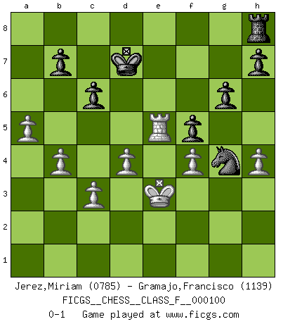 Last move : 0-1 2011 November 12 3:12:33 [Event "FICGS__CHESS__CLASS_F__000100"] [Site "FICGS"] [Date "2011.09.02"] [Round "1"] [White "Jerez,Miriam"] [Black "Gramajo,Francisco"] [Result "0-1"] [WhiteElo "0785"] [BlackElo "1139"] 1.e4 d5 2.exd5 Qxd5 3.Nc3 Qe5+ 4.Qe2 Qxe2+ 5.Ngxe2 e5 6.d3 Bb4 7.Bd2 Be6 8.g3 Nc6 9.a3 Ba5 10.O-O-O Nd4 11.Nxd4 exd4 12.Nb5 Bxd2+ 13.Rxd2 O-O-O 14.Nxa7+ Kb8 15.Nb5 c6 16.Nxd4 Rxd4 17.c3 Rd5 18.d4 Nf6 19.Bc4 Rd6 20.Bxe6 Rxe6 21.f4 Ne4 22.Re2 f5 23.h4 Nxg3 24.Rxe6 Nxh1 25.Kc2 g6 26.a4 Nf2 27.b4 Ne4 28.a5 Kc7 29.Kd3 Kd7 30.Re5 Nf2+ 31.Ke3 Ng4+ 0-1 Scandinavian (centre counter) defense Queenside Castling by player White (move 10) Queenside Castling by player Black (move 13) Player Black won this chess game. Follow this game move after move (download)Adequate compensation for a sacrifice is having a sound combination leading to a winning position; adequate compensation for a blunder is having your opponent snatch defeat from the jaws of victory. (Bruce A. Moon) Ich kenne keine einzige Person, die behaupten würde, Garri Kasparow sei ein guter Mensch (Nigel Short) Hay jugadores fuertes y personas amables y yo soy un jugador fuerte. (Bobby Fischer) Le joueur d'Echecs qui veut atteindre le top est obligé de développer son propre credo créatif. Alexeï Stepanovicth Souétine. Il est facile d'écrire des livres ! Ce qui est difficile, c'est de jouer ! (Alexeï Stepanovicth Souétine) All war is based on deception. (Sun Tzu)
